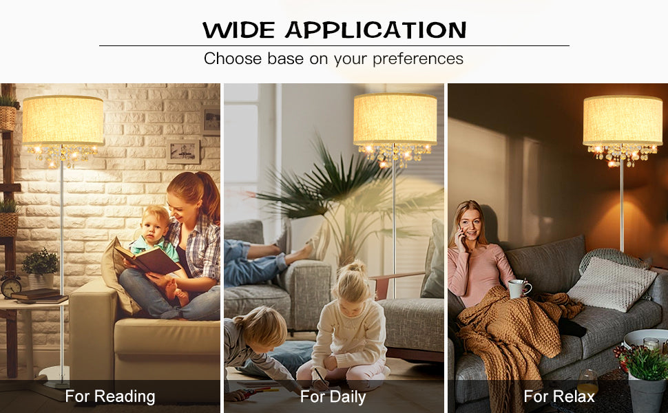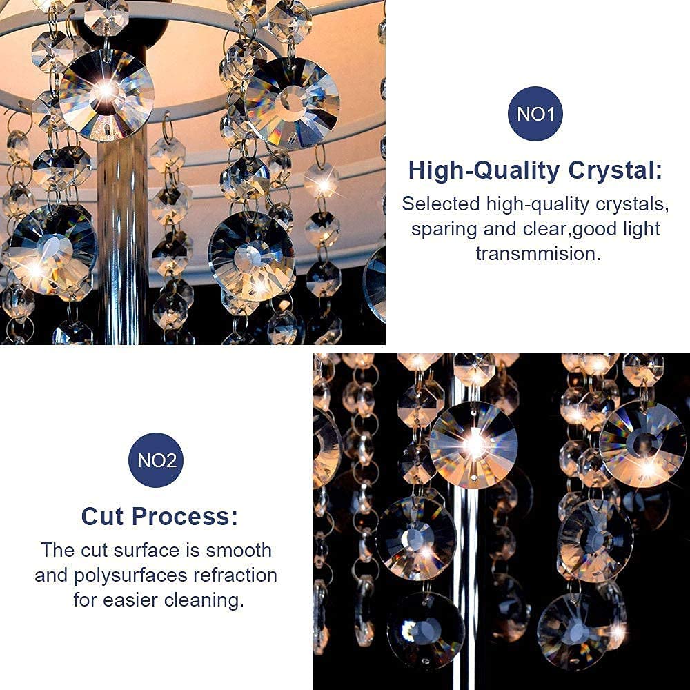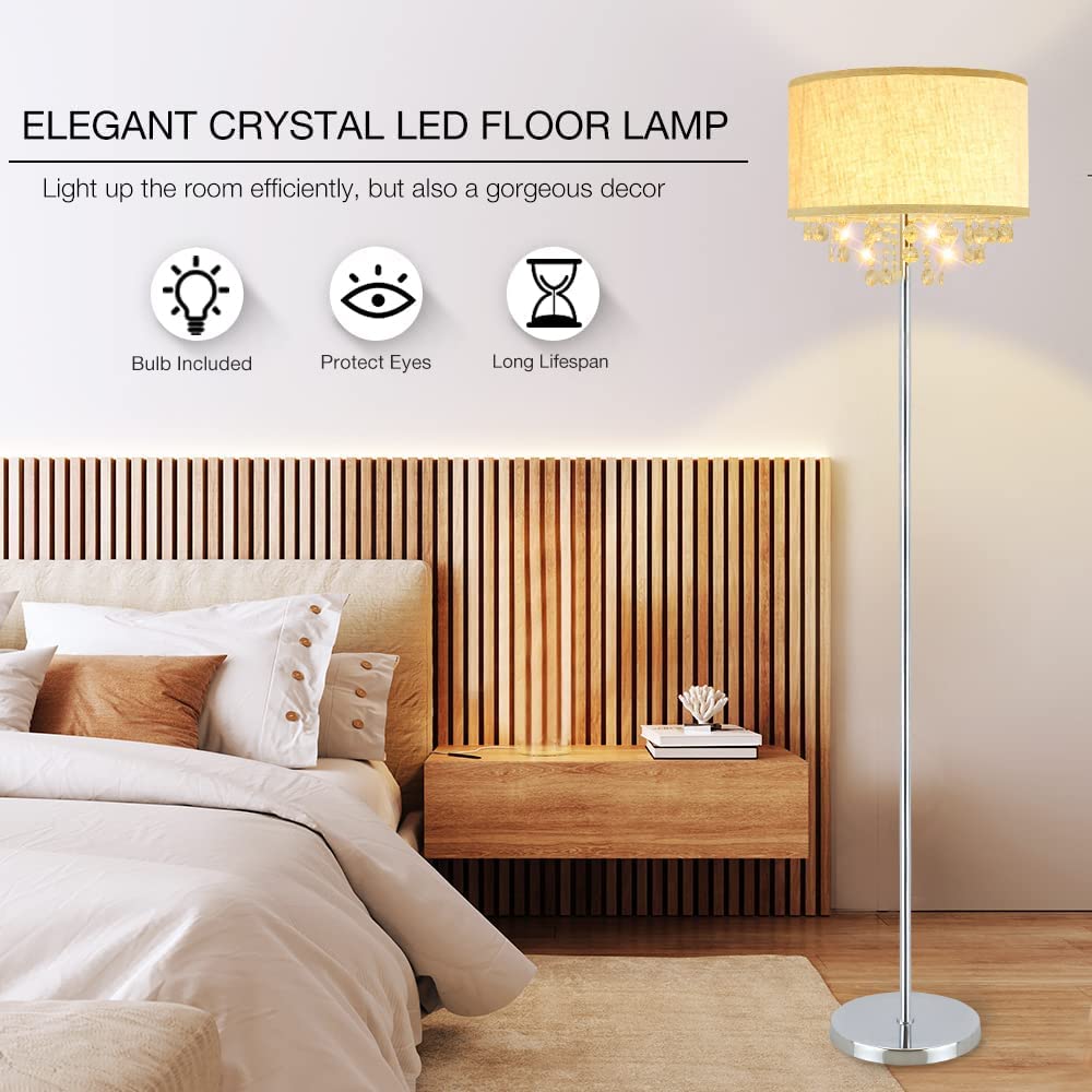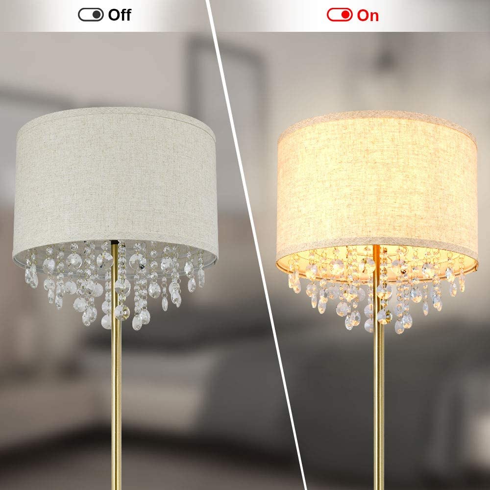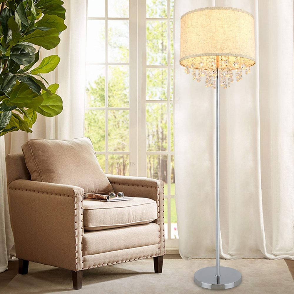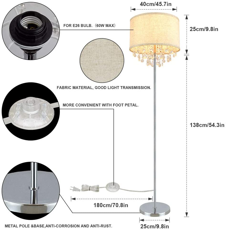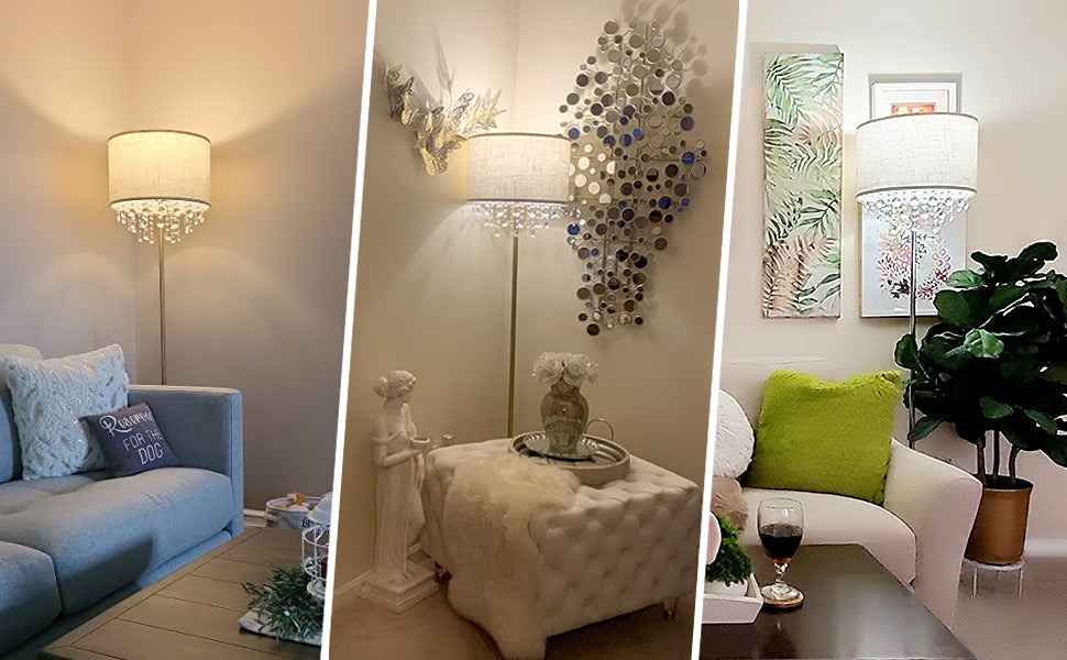 - Sparkling Crystals:Tämä korkea lattiavalaisin on valittu korkealaatuisista kristalleista, ja sen rummun muotoinen kangasvarjostin on ainutlaatuinen ja tyylikäs. Valo heijastaa kirkkaan valovaikutelman kristallin läpi, joten kun katsot sitä eri kulmista, se luo kiiltoa kuin kimaltelevat tähdet.