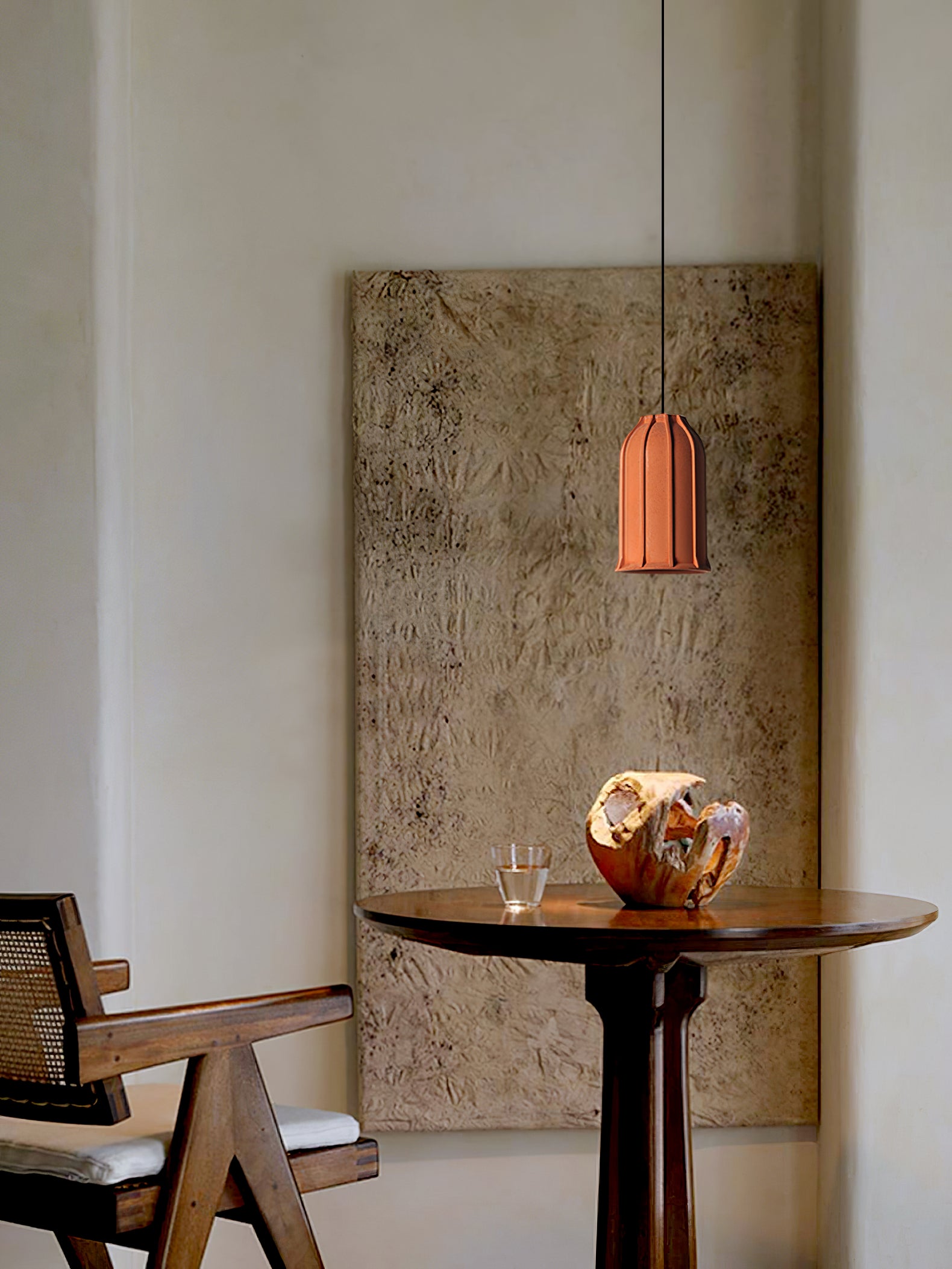 Teollisuusvalussa käytettyjen perinteisten tuotantomuottien inspiroima Skeleton muuttaa teollisen olemuksensa valmistamalla kestävän koneen kaltaisen muodon pehmeästä ja orgaanisesta materiaalista. Lyhyet tukirivat rikastavat pohjalla olevaa geometriaa, kun taas luonnollinen raakamaa-tekstuuri luo alitajuisen yhteyden yhteen luonnon peruselementeistä.
