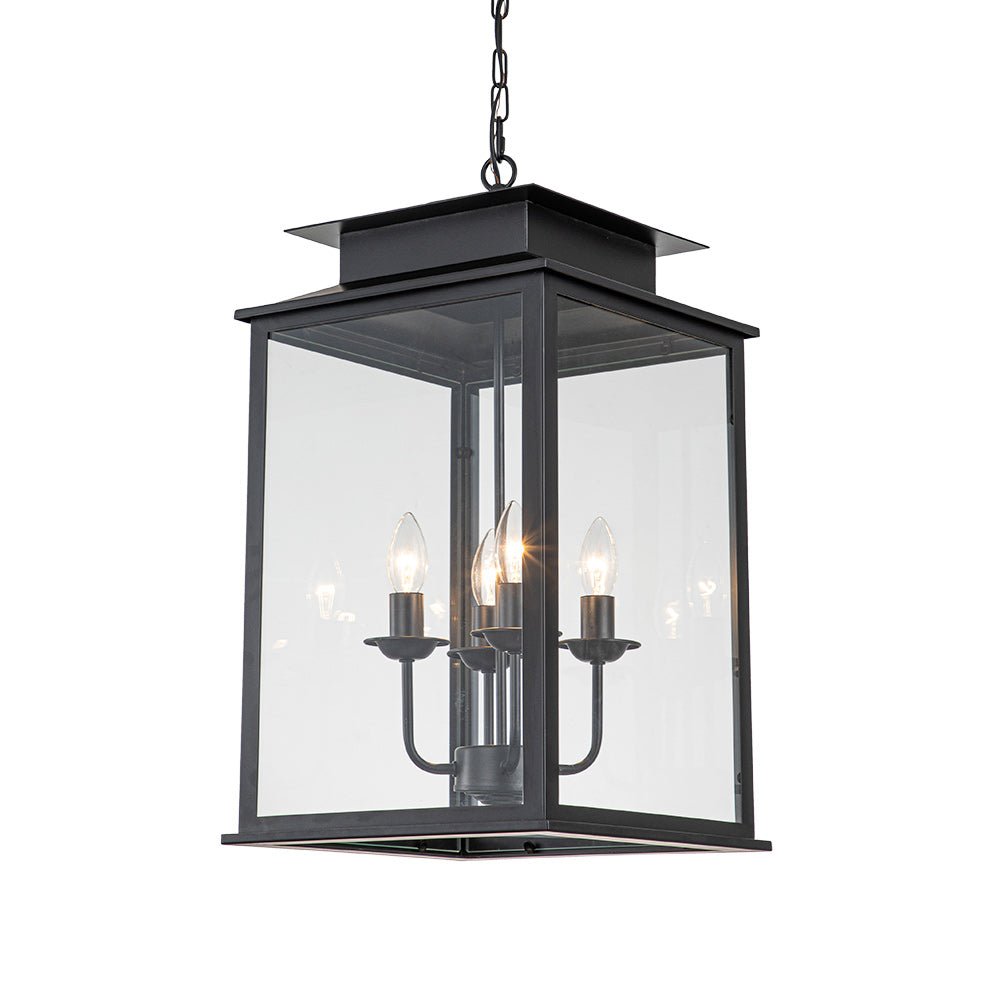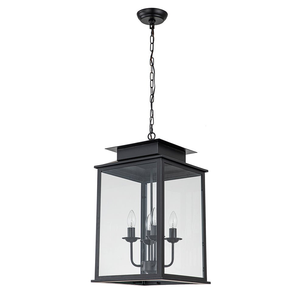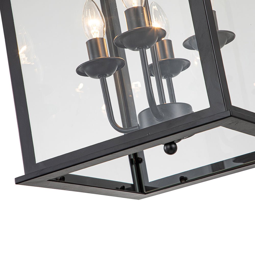 Neljä valoa • Neliömäinen lyhty • Kirkas lasi • Musta viimeistely • E12/14 kynttelikköpolttimot (ei sisälly) • Kiinteä • UL-listattu