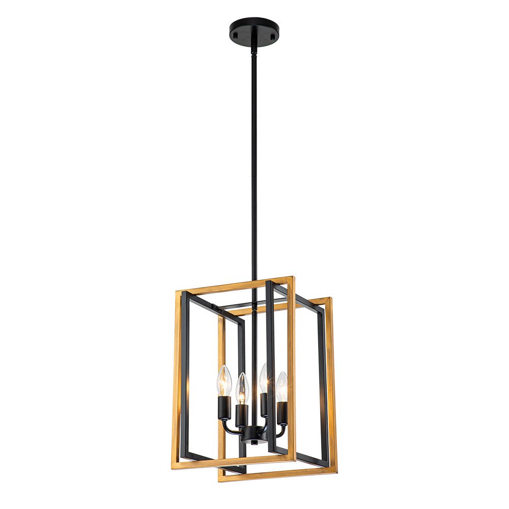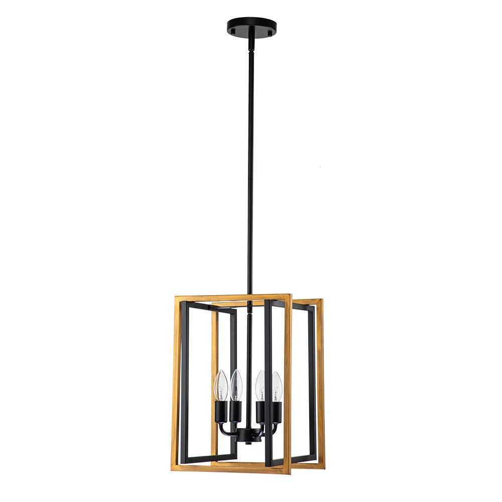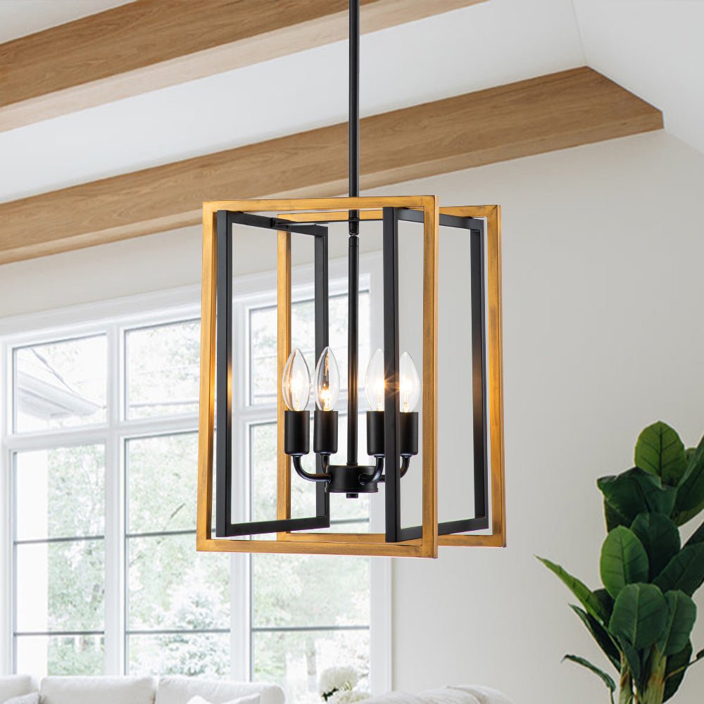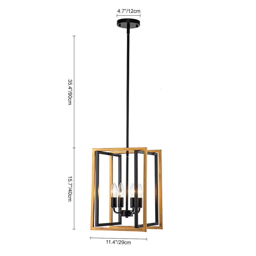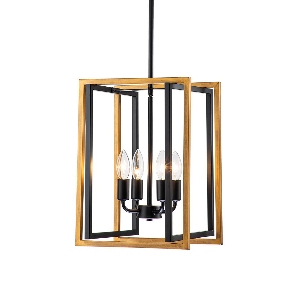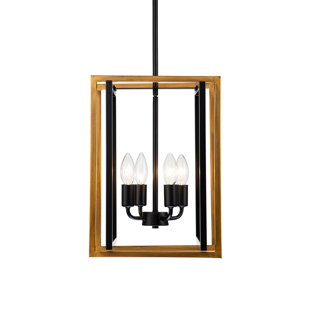 Tässä modernissa maalaistalossa ja teollisuusvaikutteisessa avoimessa metalliriipusessa on ilmava neliönmuotoinen lyhty, jossa on 4-valon kynttilätyyppinen pistorasia. Tämä mattamustalla ja maalatulla kullalla viimeistelty lyhtyvalaisipus on valmistettu neljästä suorakaiteen muotoisesta kappaleesta geometrisen siluetin luomiseksi. Neljä esillä olevaa 40 W E12/E14 kynttelikköpolttimoa (ei sisällä) antaa lisävaloa ja täydentää tämän geometrisen riippuvalaisimen vintagea. Suosittelemme keittiösaarekkeen, ruokapöydän tai eteisen valaisemista tällä neliömäisellä 4-valon lyhtyriipuksella.Tiedot
