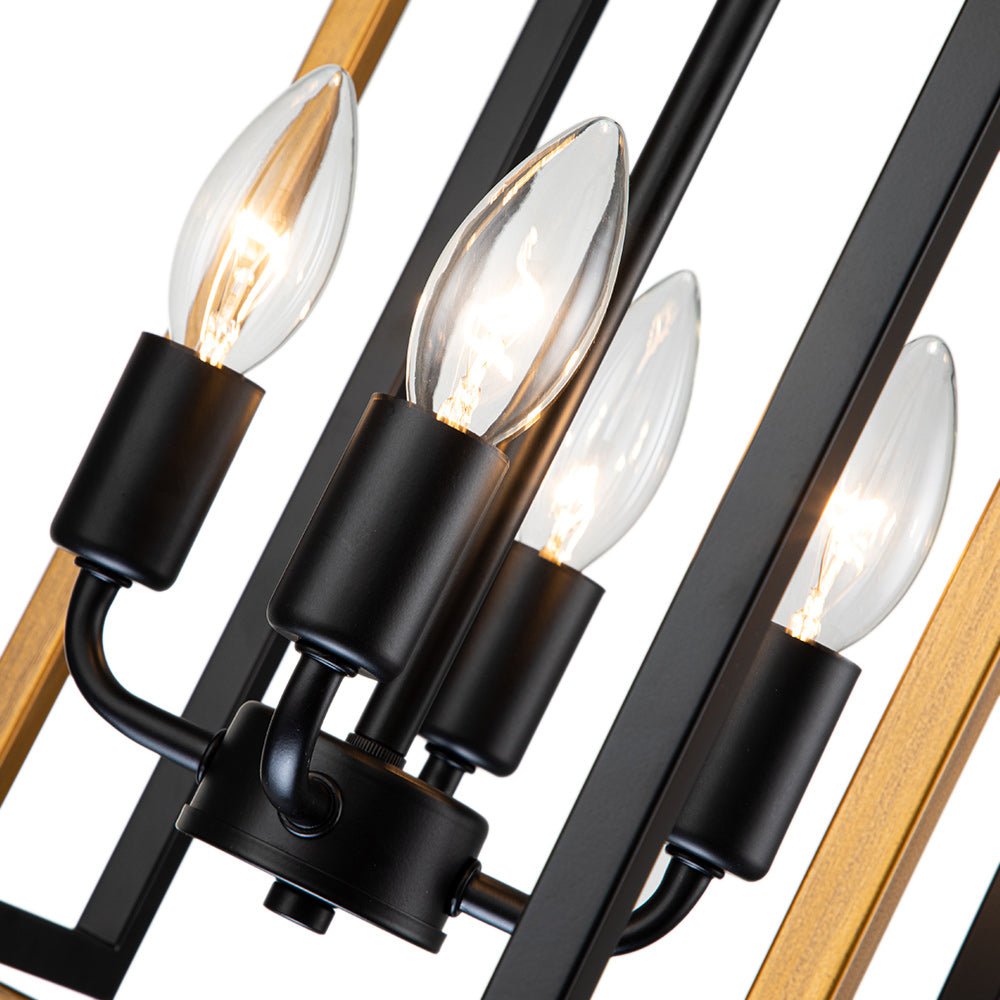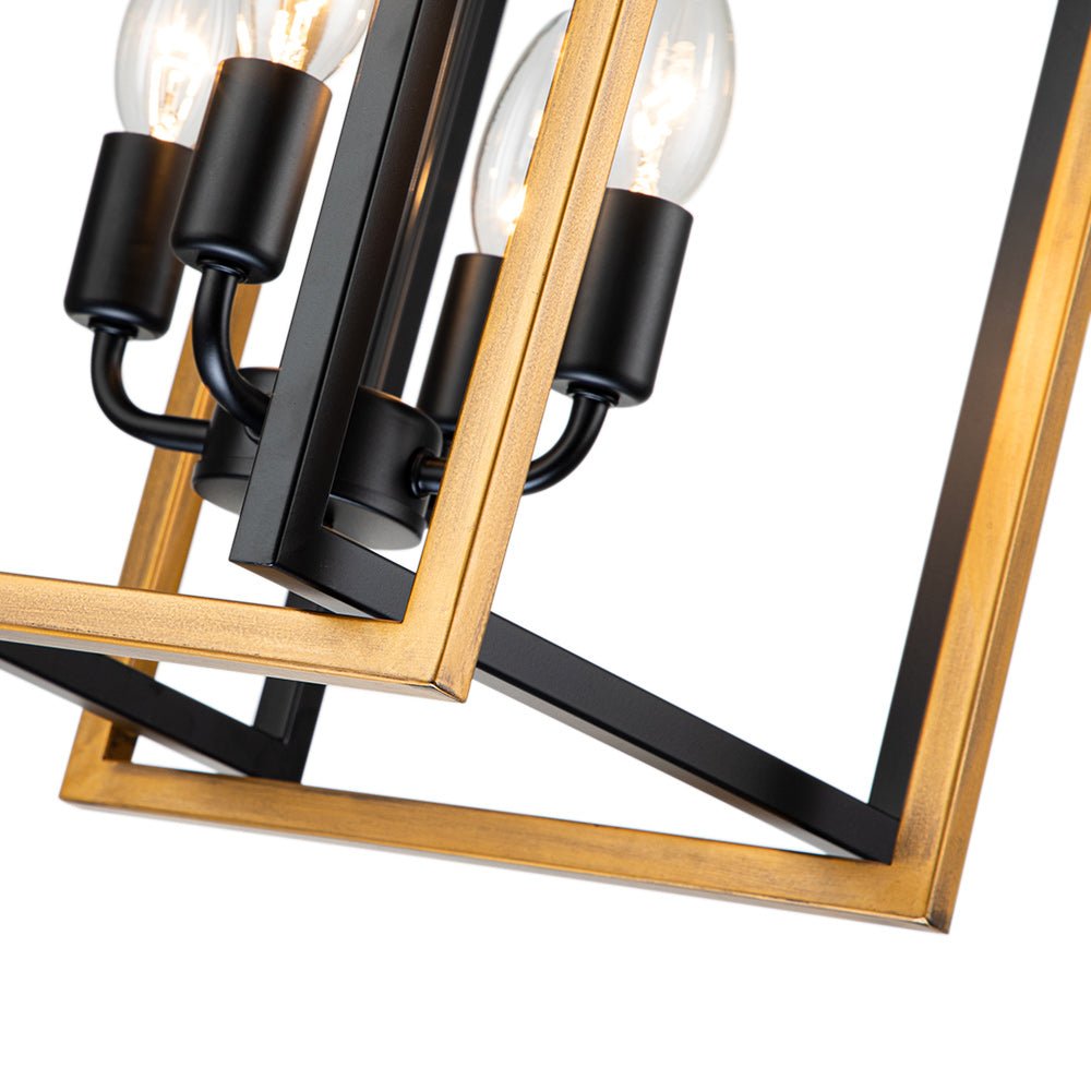Neljä valoa • Avoin neliömuotoilu • Metallirunko • Musta + kultaviimeistely • E12/14 kynttelikköpolttimot (ei sisälly) • Kiinteä • UL-listattu