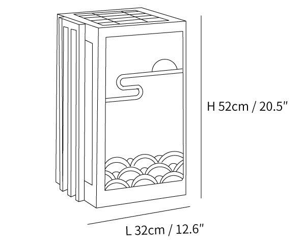 Aurinkovoimalla toimiva versio Koko: P 32 cm x L 30 cm x K 52 cm / P 12,6″ x L 11,8 x K 20,5″
