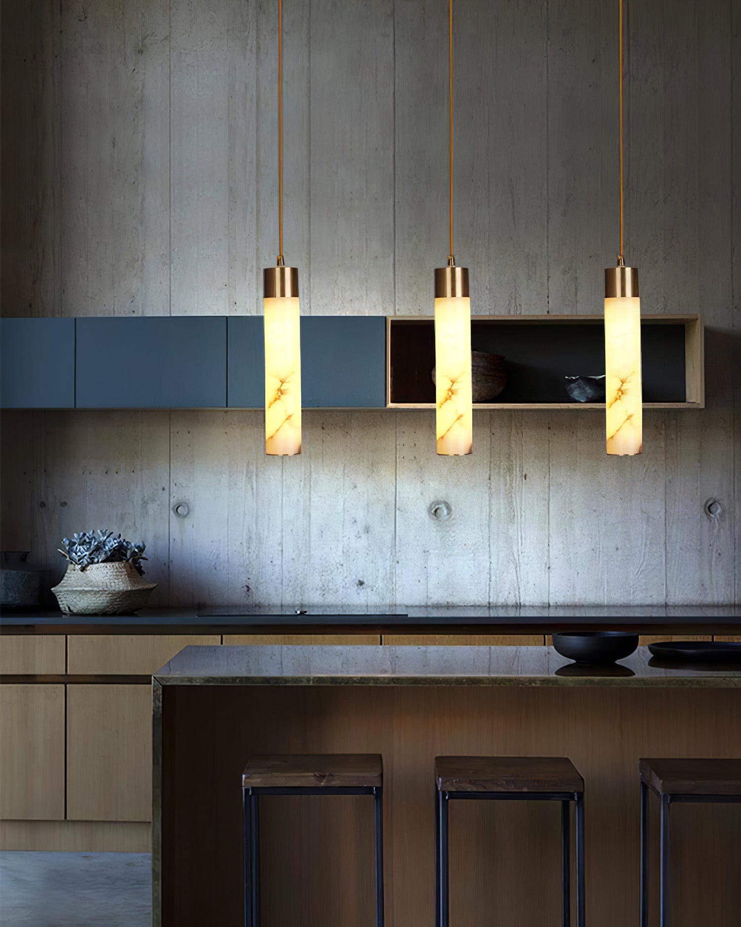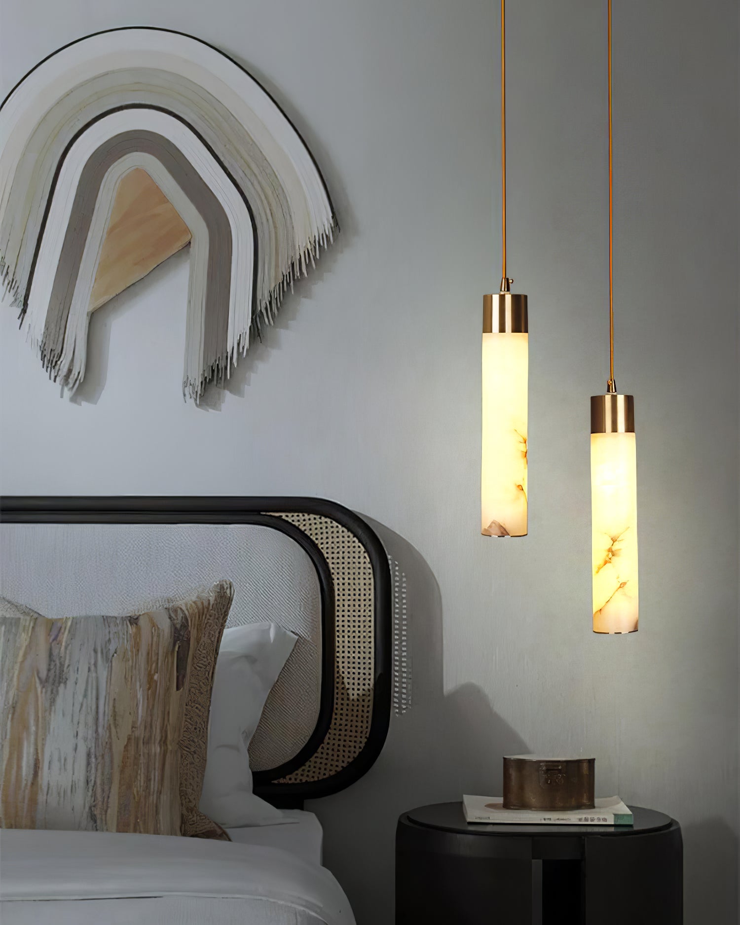 Albaster-pinnoilla teksturoidut ja päistään kiillotetut jalustat on varusteltu hellävaraisella messingistä valmistetulla pintakäsittelyllä. Rakastamme ympäristön hehkua ja orgaanista aksenttia, jonka tämä riippuvalaisin tarjoaa moderneihin asuintiloihin.