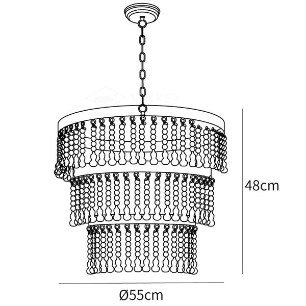 Boheemin inspiroima ote klassiseen kattokruunuun, tämä muotoilu vangitsee taatusti katseet, olipa kyseessä vieraiden tervehtiminen sisäänkäynnillä tai ruokapöydän valaiseminen. Tämä kolmikerroksinen valaisin on valmistettu metallista ja puusta, ja sen pyöreä siluetti esittelee joukon riippuhelmiä, jotka antavat tuulista, rentoa ilmaa tähän erottuvaan muotoiluun.