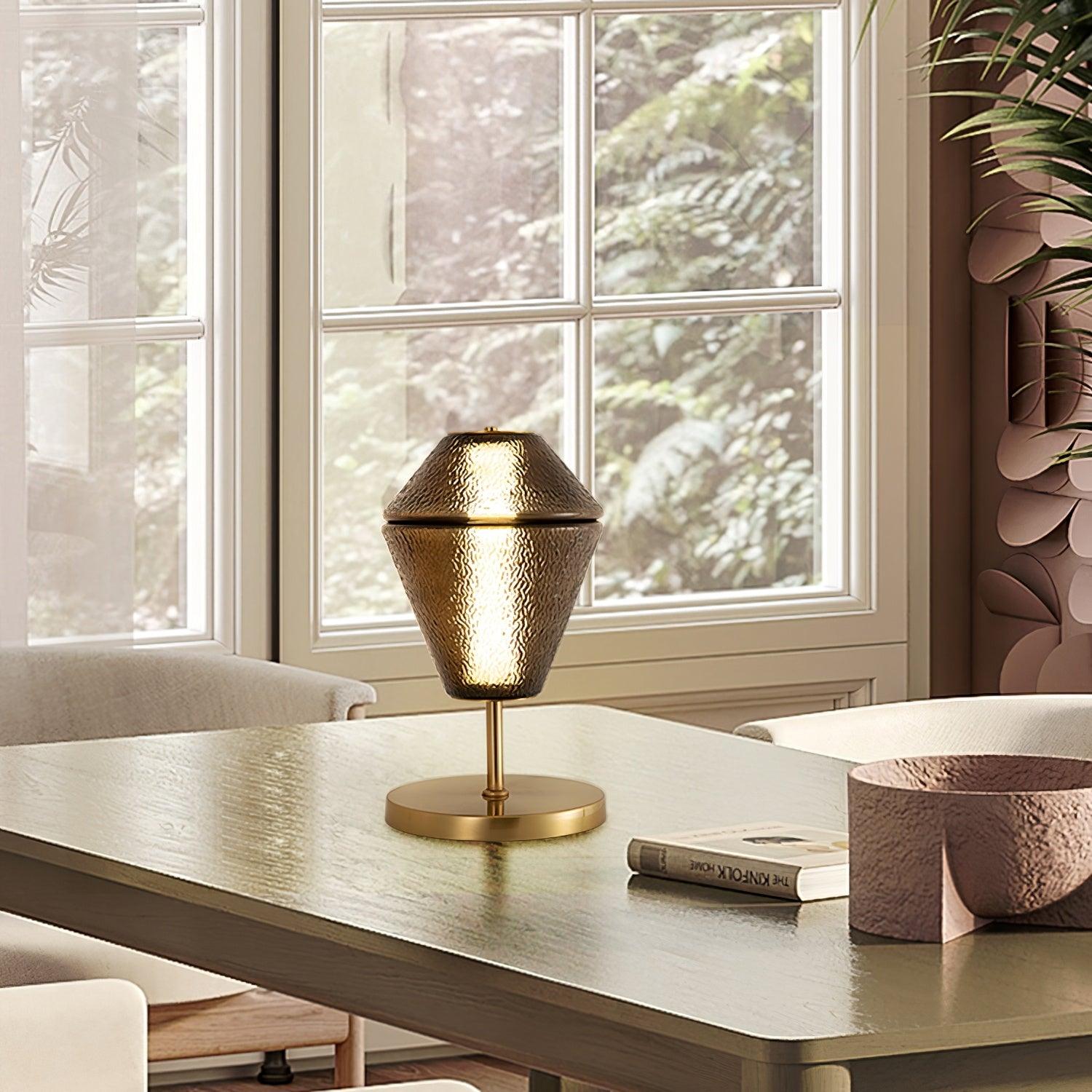 Totem Glass -pöytävalaisimemme yhdistää klassisen ja nykyajan valaisimen kauniin kultaisen jalustan ja uurreisen lasivarjostimen kautta. on ainutlaatuisen tyylikäs kappale.