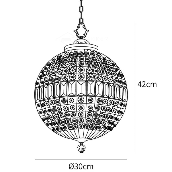 Tuo loistava tyyli ruokasaliin, makuuhuoneeseen tai eteiseen tällä glamivalaisimella. Rakastamme tämän kappaleen ripustamista yksinään tai moninkertaisina saadaksemme dramaattisempaa ilmettä. Se on valmistettu kullan sävyisestä metallista, ja siinä on säädettävä ketju ja koristeellinen otsake, jossa on vastaava pohjapää. Maapallovarjostimessa on häkkimuotoilu, joka on peitetty kirkkailla kristalliriveillä, jotka kimaltelevat valossa.