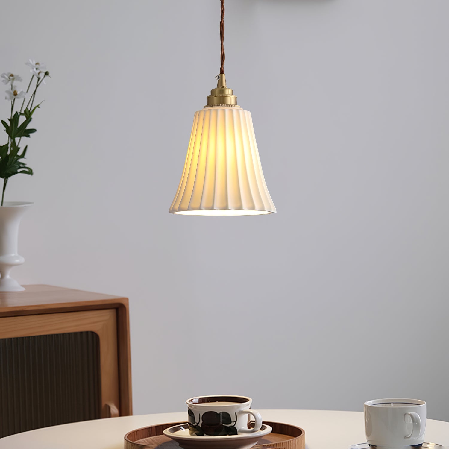 Trumpetin keraamisessa riippuvalaisimessa on vuosisadan puolivälin kiinalaisvaikutteinen keraaminen muotoilu. Perinteinen sadan laskoksen trumpetin muoto tarjoaa ainutlaatuisen korostuksen mihin tahansa tilaan. Täydellinen kaikille, jotka etsivät upeaa valaisinta, joka erottuu joukosta.