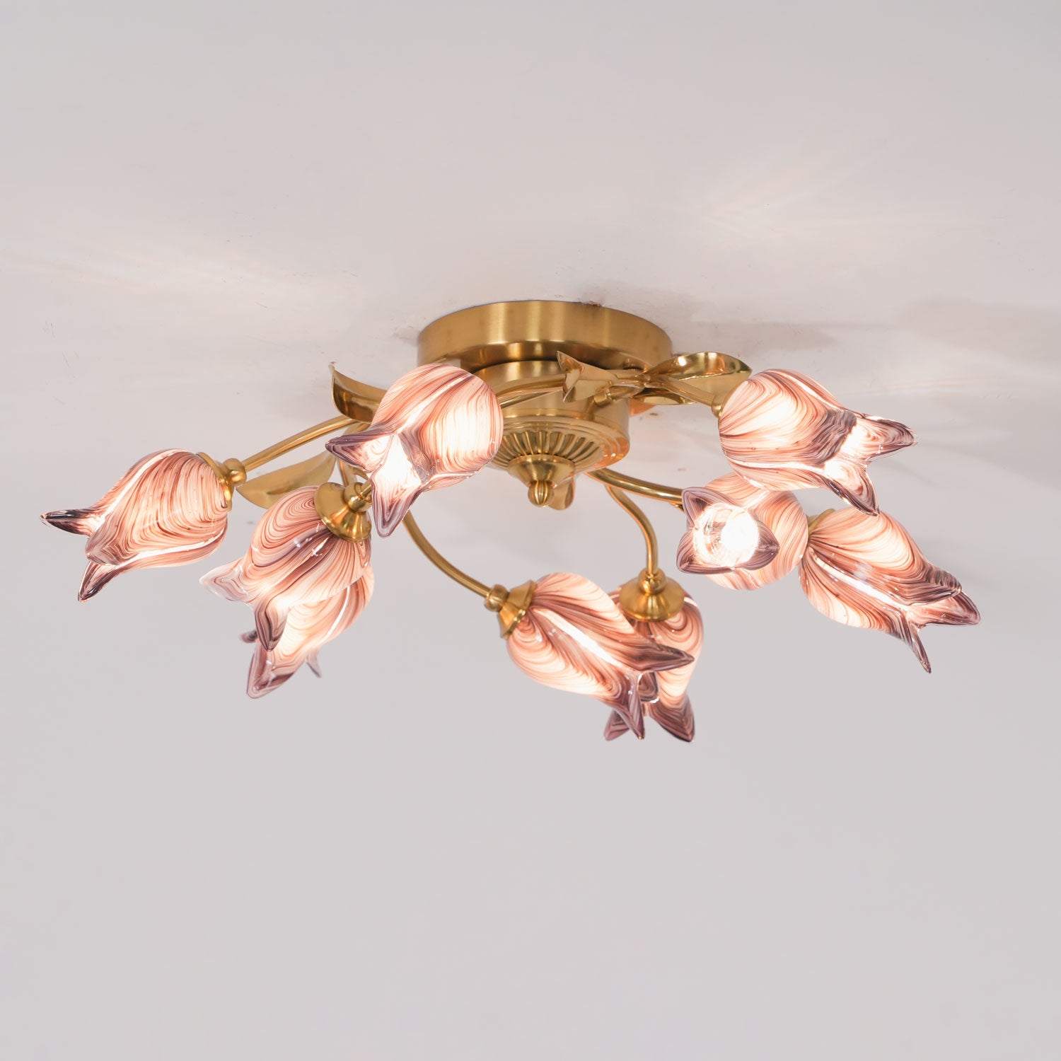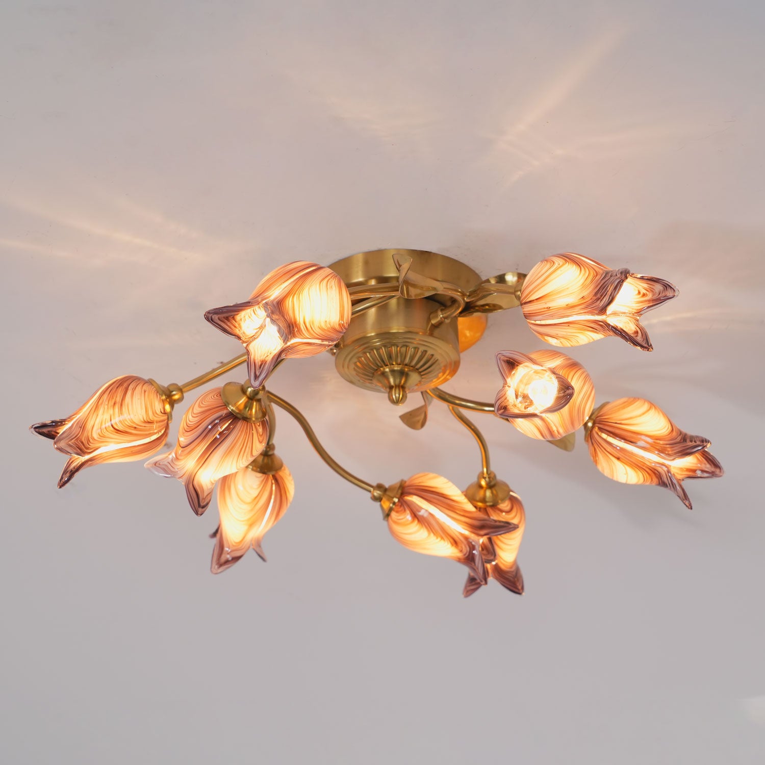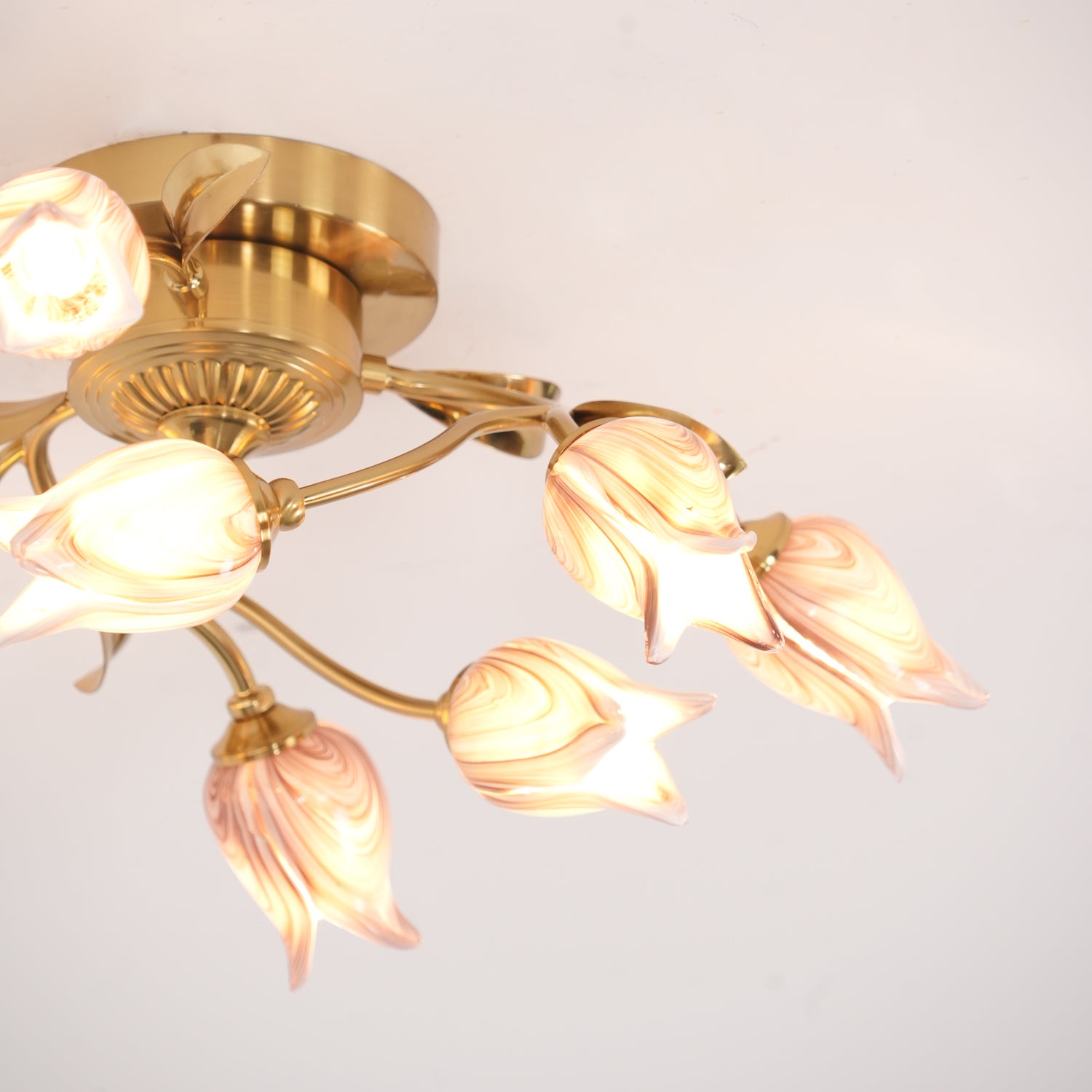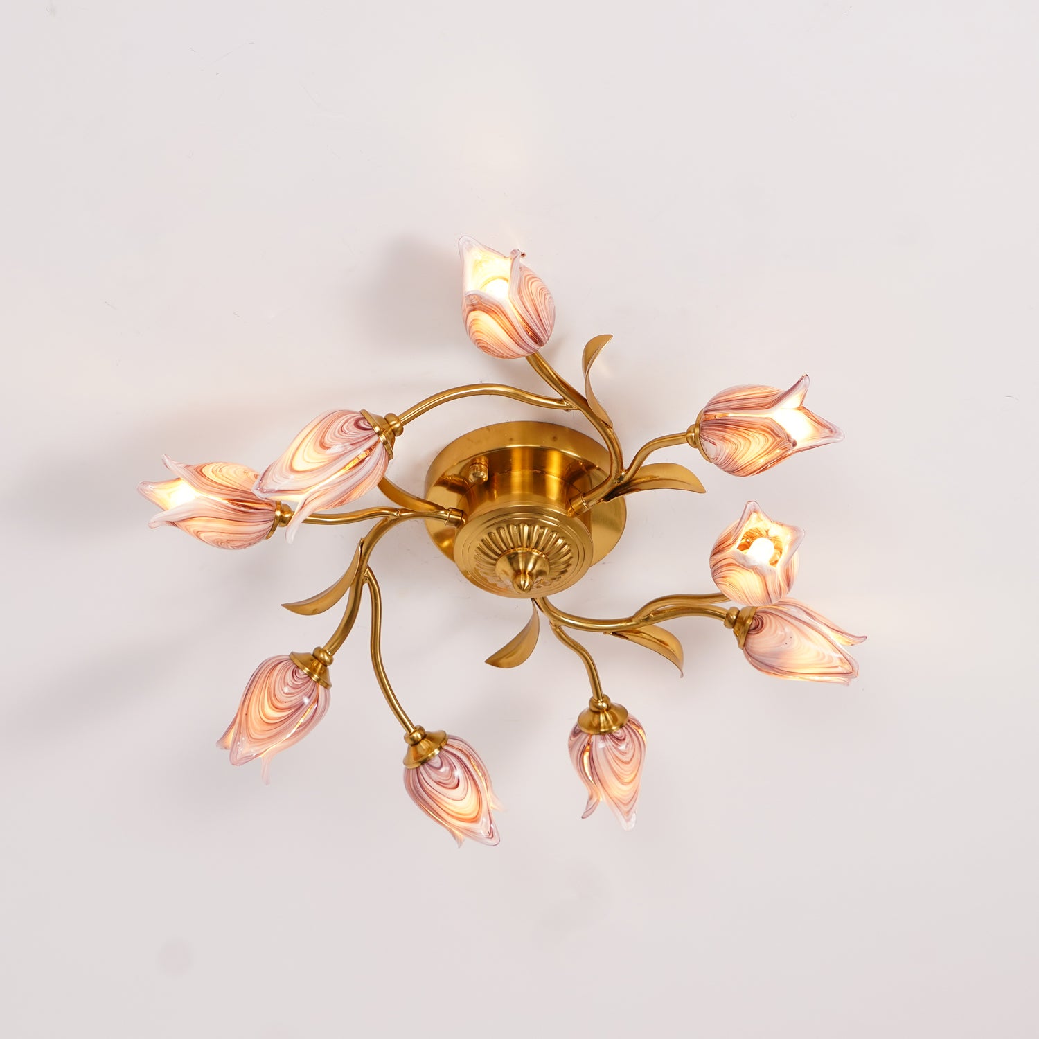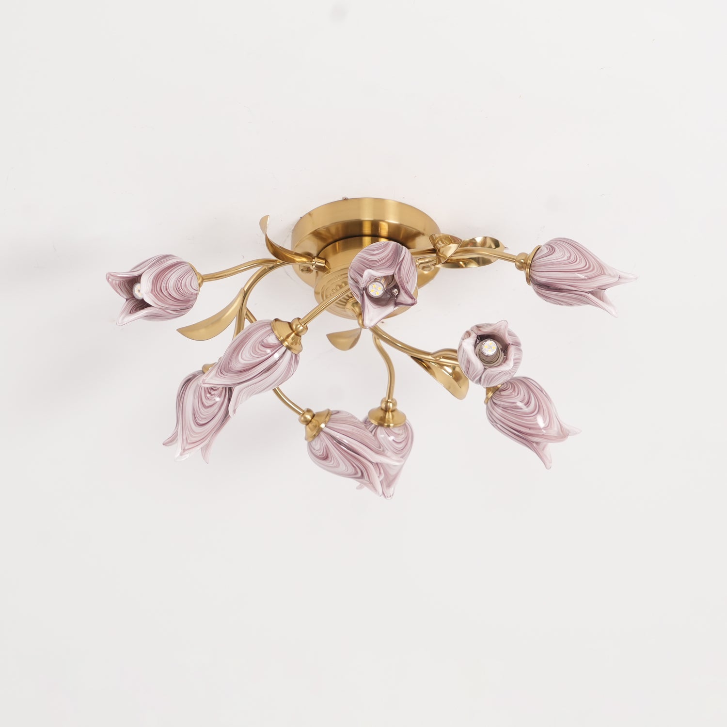 Tulip Serenade -kattovalaisin juhlistaa kukkien eleganssia ja herkkua upotetulla asennuksella. Sen lasiset tulppaanisävyt pyörivät monimutkaisissa vaaleanpunaisen ja valkoisen sävyissä, mikä tuo mieleen lempeän auringonnousun. Metalliset aksentit lisäävät pehmeää kultaista hohtoa ja tarjoavat lempeää mutta runsaasti valoa ylhäältä. Täydellinen tiloihin, joissa tarvitaan riipusta tai kattokruunu.