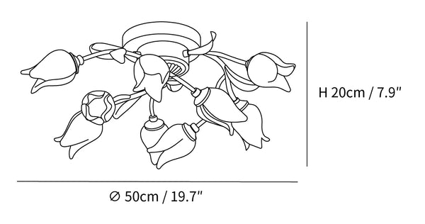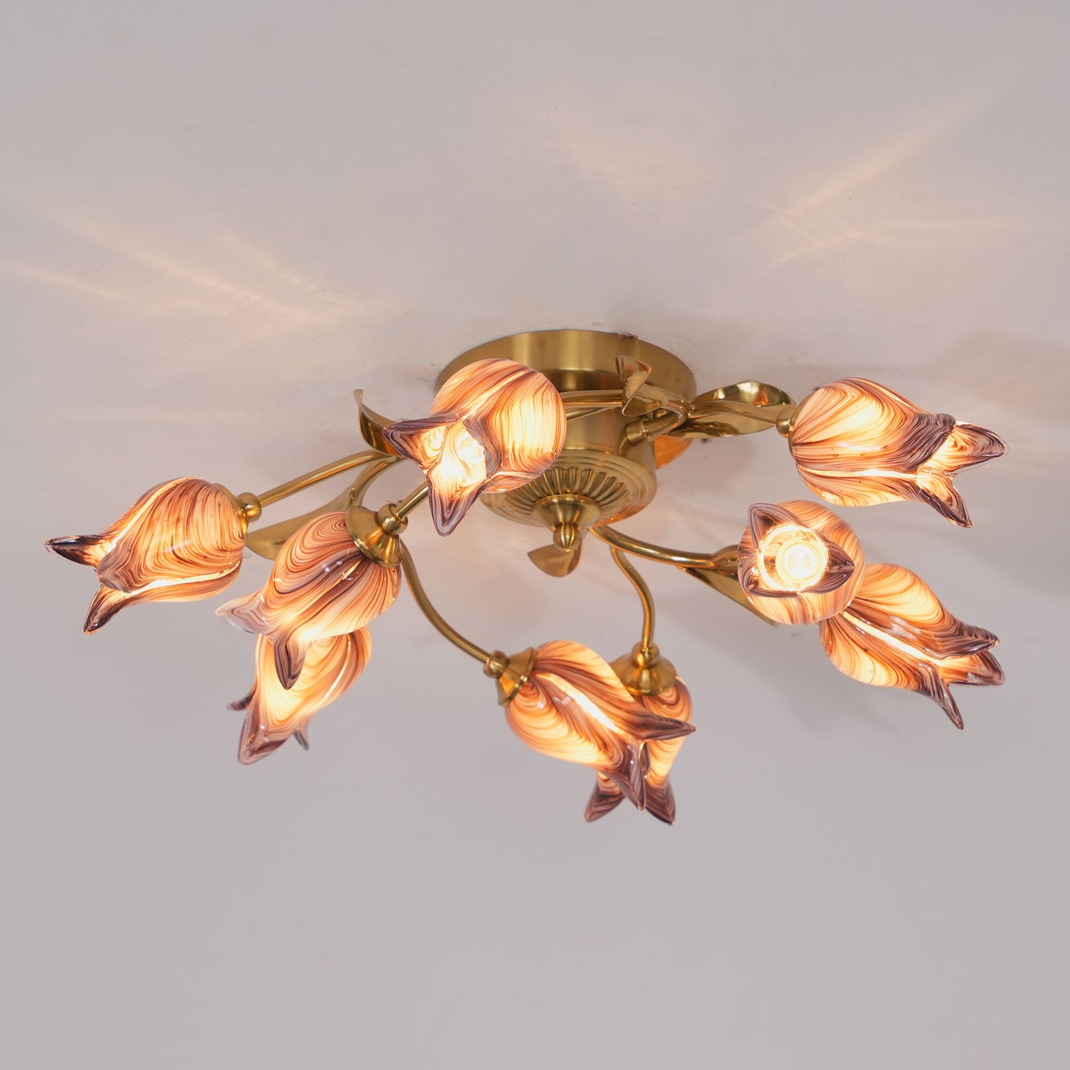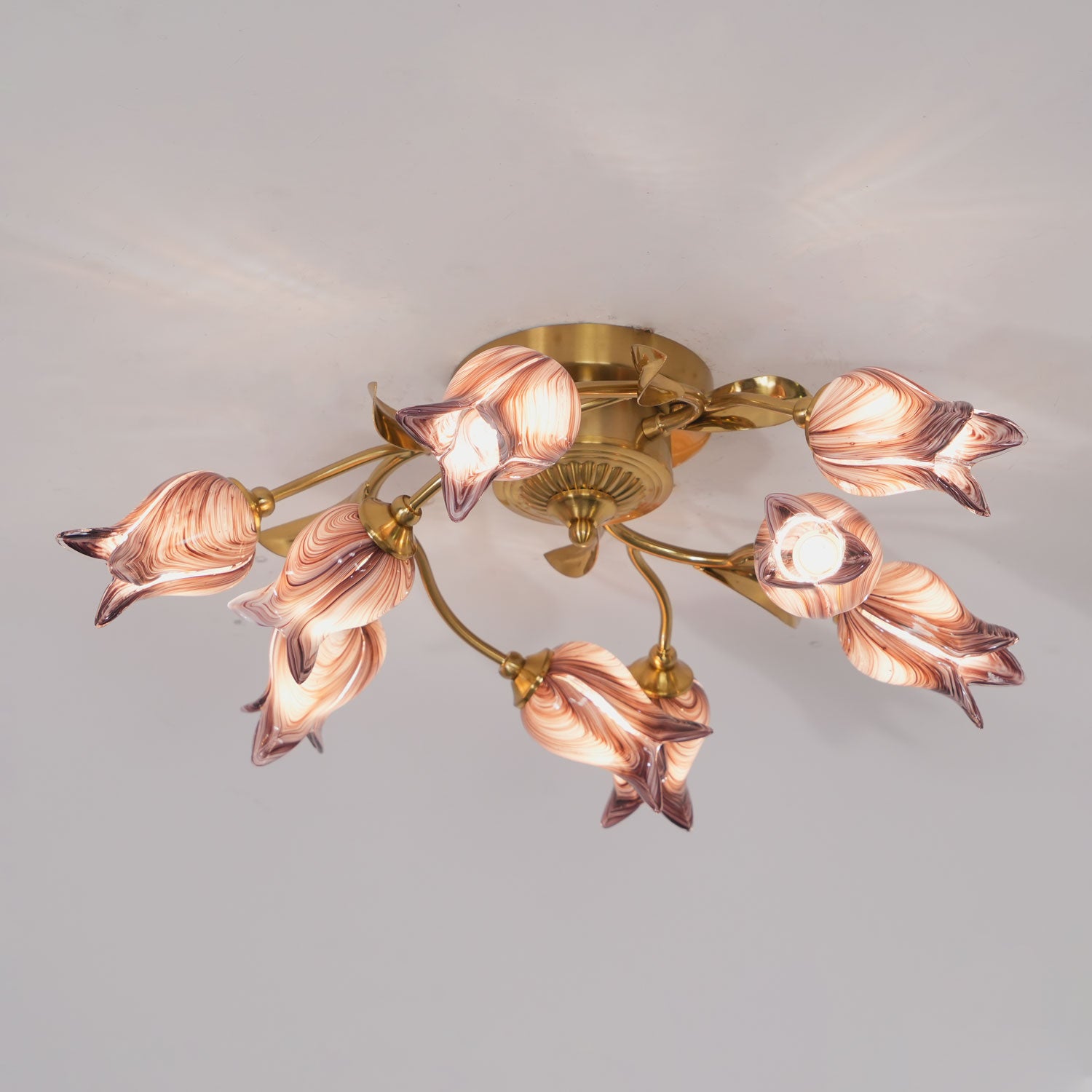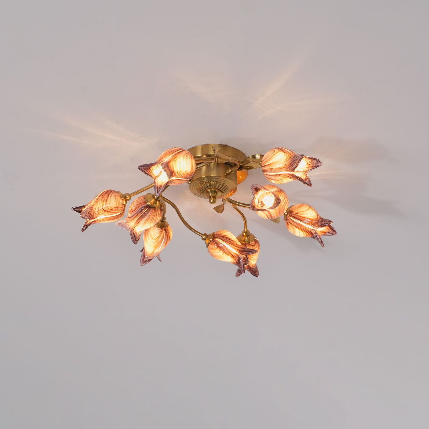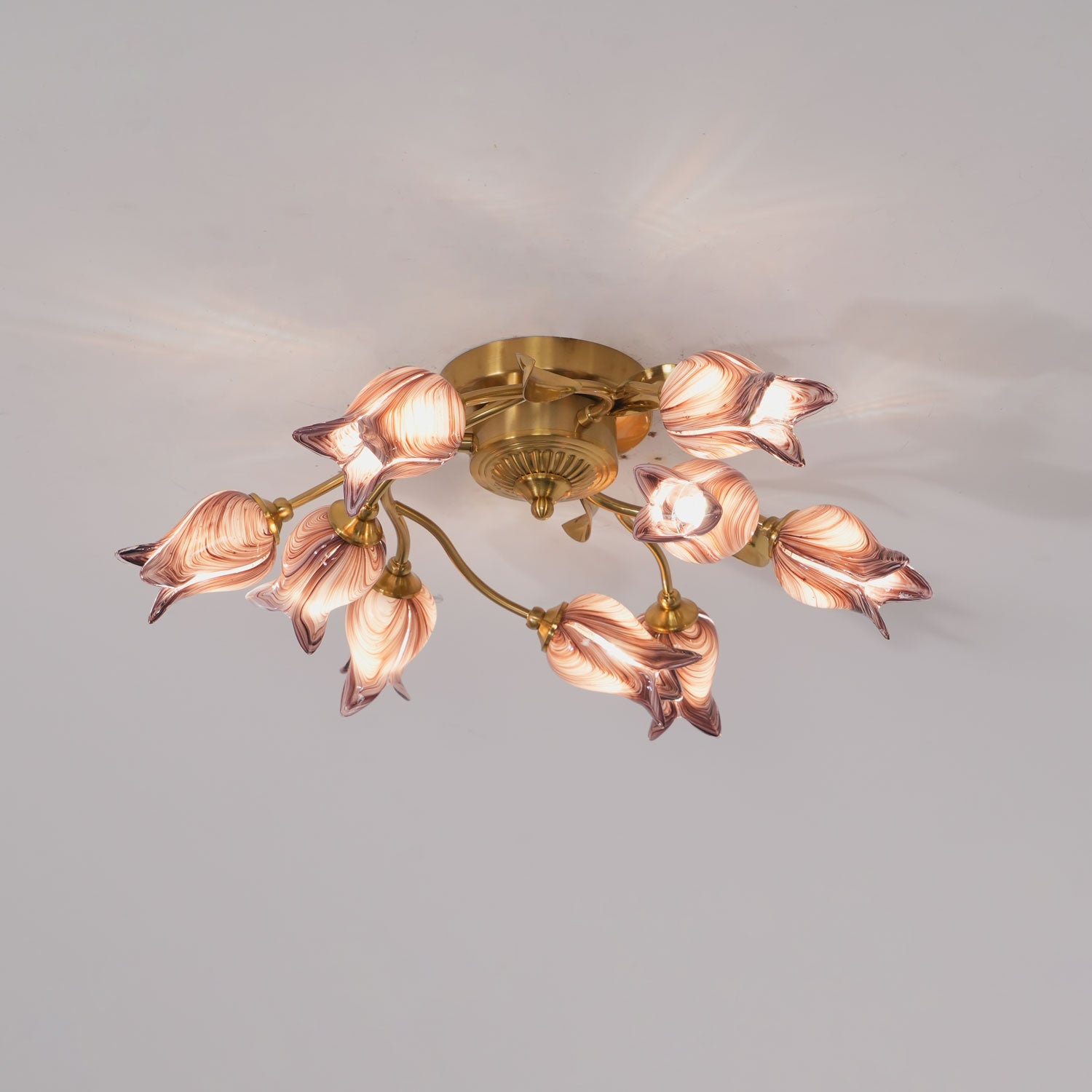 Tulip Serenade -kattovalaisin juhlistaa kukkien eleganssia ja herkkua upotetulla asennuksella. Sen lasiset tulppaanisävyt pyörivät monimutkaisissa vaaleanpunaisen ja valkoisen sävyissä, mikä tuo mieleen lempeän auringonnousun. Metalliset aksentit lisäävät pehmeää kultaista hohtoa ja tarjoavat lempeää mutta runsaasti valoa ylhäältä. Täydellinen tiloihin, joissa tarvitaan riipusta tai kattokruunu.