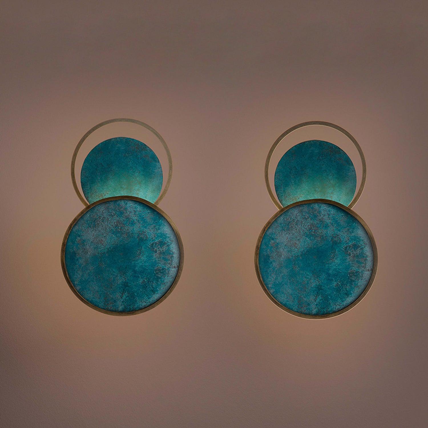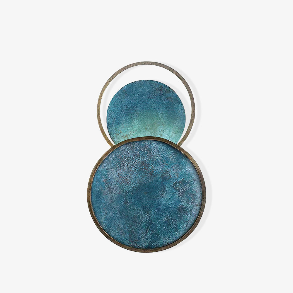 Liikkemme suunnittelema lumoava esine d'art, tämä upea kiikari lisää hypnoottista ja lumoavaa silausta nykyaikaiseen seinään. Pyöreän ja hohtavan satelliitin inspiroima siinä on kaksi hapetettua ympyrää, jotka ympäröivät kahta poikkeuksellista pyöreää elementtiä hapetettuna, luonnollisen turkoosin sävyn kanssa. Tämä pyöreä koristelu on läpinäkymätön ja LED valaisee lampun sivulta.