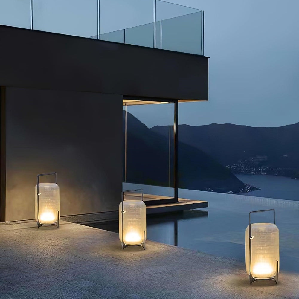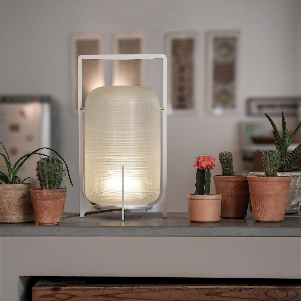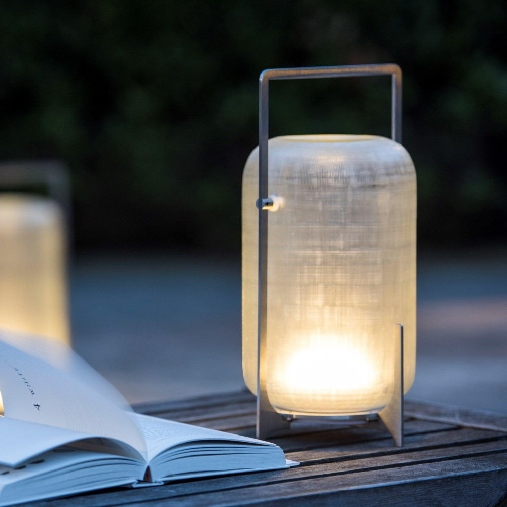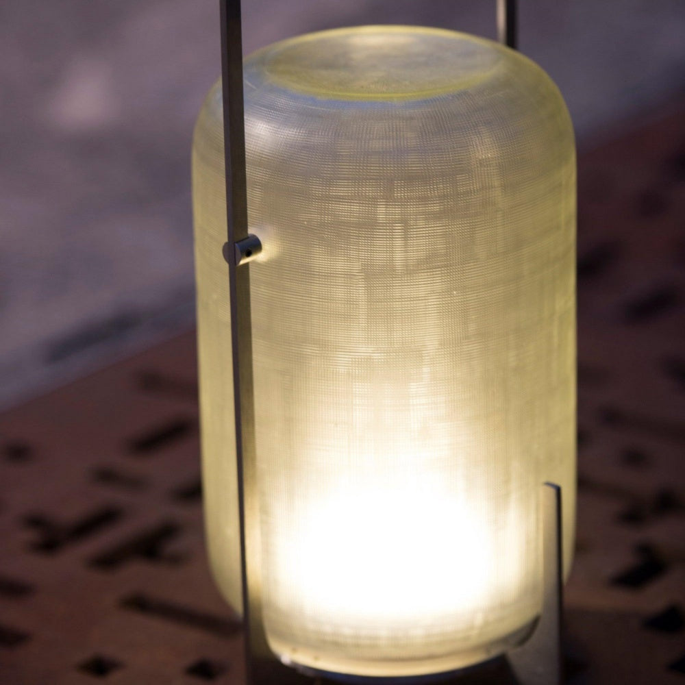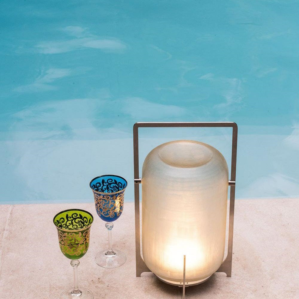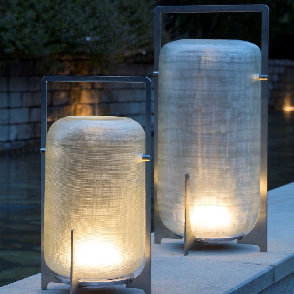 Tarkoituksella arvokas mutta välttämätön lamppu; varjostin on hienoksi käsin veistetty valkoinen puhallettu lasi. Rakenne on valmistettu ruostumattomasta teräksestä, joka sopii erinomaisesti ulkokäyttöön ja kestää hyvin ilmakehän tekijöitä.