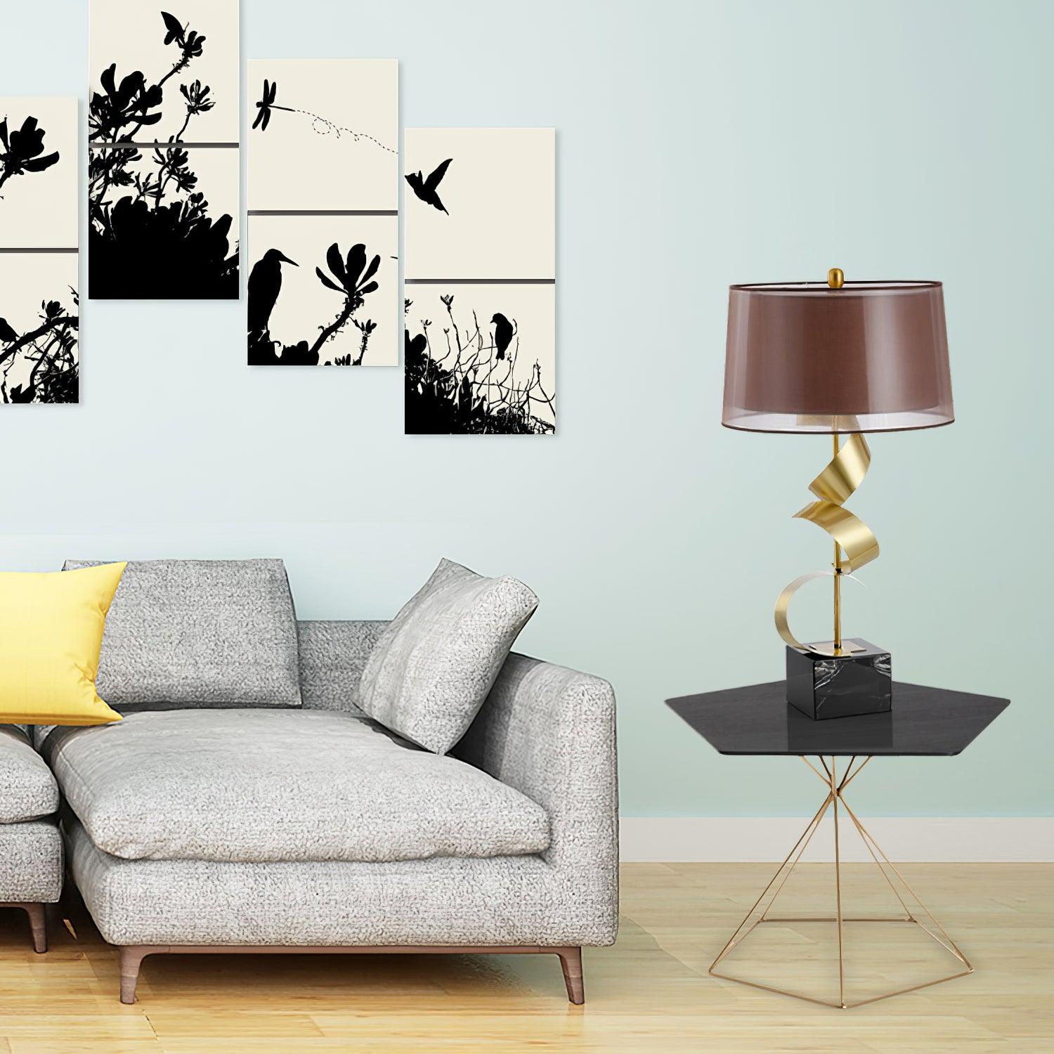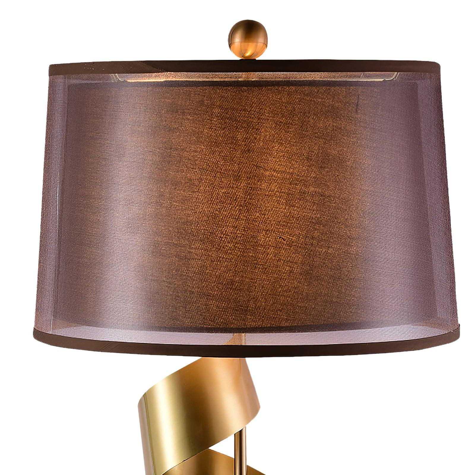Loistava spiraalimuotoilu tekee tästä kauniista pöytävalaistuksesta puhuvan kappaleen, lehtikultainen viimeistely, ruskea puuvillakangasvarjostin ja upea musta marmorialusta.
