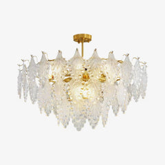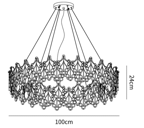 Laadukas metallirunko on ripustettu monikerroksisilla käsintehdyillä kaiverretuilla lasitiileillä, jotka vangitsevat täydellisesti valon, luovat lämmintä kiiltoa tilaan ja välittävät viehättävää eleganssia, josta pidät. Laminoitu muotoilu, joka koostuu käsintehdyistä lasipaloista, tämä suuri kattokruunu voi tanssia tuulenpuuskassa, lisäämällä jälkeä liikettä ja hauskaa. Tarjotakseen asiakkaille luonnollisimman ja nykyaikaisimman kosketuksen, se käyttää korkealaatuisia materiaaleja säilyttääkseen ulkonäön kestävästi. Anna loistavan valon kulkea kerrosten lasipalojen läpi luodaksesi lämpimän ja upean valon ruokapöytääsi, keittiösaarekettasi ja olohuoneeseesi.