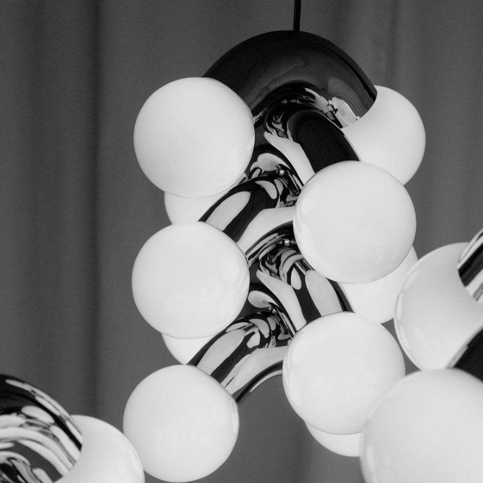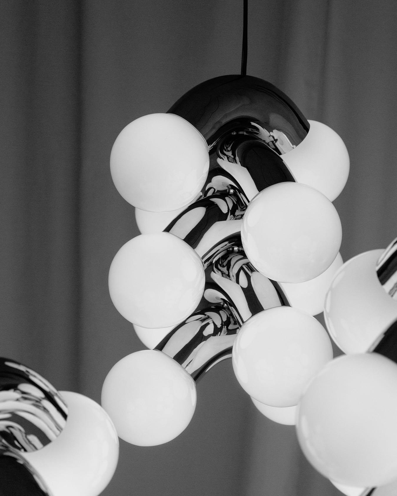 Vine-sarja esittelee liioiteltua muotoa ja taipumusta toistoon, mikä johtaa rohkeaan vaikutukseen. Koostuu tasapainoisesta kromikaaresta, jota reunustavat kaksi hehkuvaa lasipalloa – moduulin moninkertaistuminen mahdollistaa valaisimen kasvamisen, mikä yliarvioi valaisimen kokonaissiluetin eksponentiaalisesti.