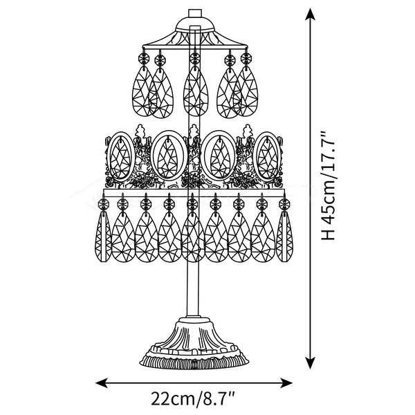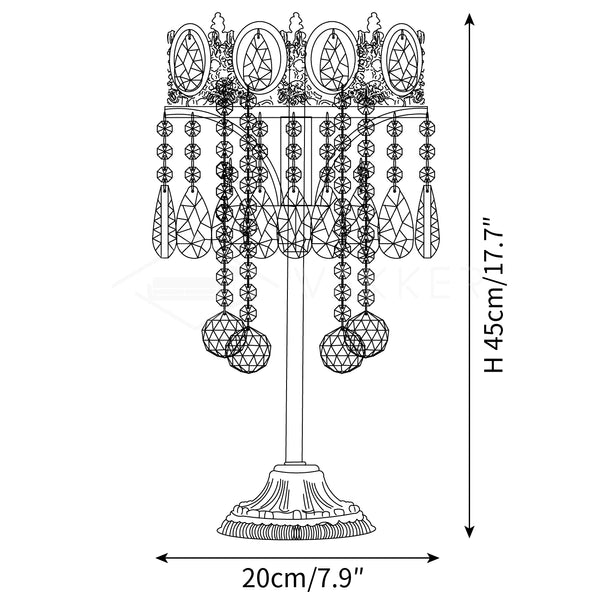 Koko: Halkaisija 20 cm x K 45 cm / ∅ 7,9″ x H 17,7″ Koko: Halkaisija 22 cm x K 45 cm / ∅ 8,7″ x__1_10117_10111. ″ Tiedot Materiaali: Metalli, rauta, kristallit Valonlähde: LED-lamppu tai Edison-lamppu Valonlähteen perustyyppi: E14 (kuten alla) Teho: Max 15W Jännite: AC 110-240V Asennus: pöytä Ympäristö: Sisätilat Paino: 3kg / 6,6lbs Akku: Ei Ajuri vaaditaan: Ei Viimeistelyt: Kuparointi Kristaaliväri: Kirkas Prosessi: Leikkaus, kiillotettu, Galvanointi Ohjaustapa: painikekytkin (ei himmennettävä) K: Tukeeko se himmennystä? A: Se, tukeeko se himmennystä, riippuu ostamastasi lampun tyypistä. Jos ostat himmennyspolttimo, tämä lamppu saavuttaa himmennystoiminnon. Toimitamme 150 cm / 59" johdot kytkinpistokkeilla. Voidaan pidentää pyynnöstä.