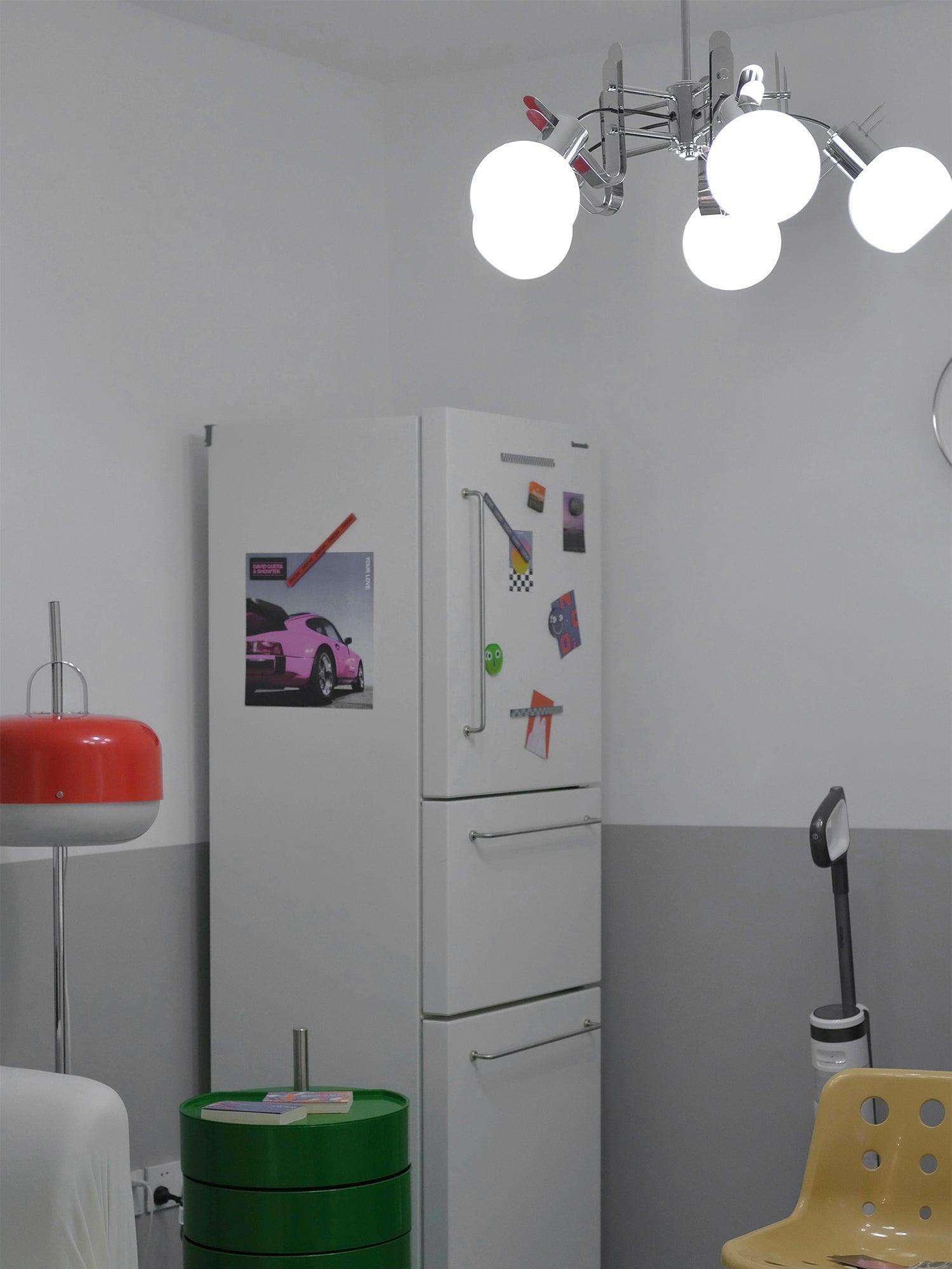 Tämä kaunis valaistus on peräisin 70-luvulta Jugoslaviasta. Tämä vuosisadan puolivälin moderni riippuvalaisin koostuu valkoisista lasipalloista. Se antaa erityisen salaman syttyessään. Tämä kattokruunu on todellinen katseenvangitsija.