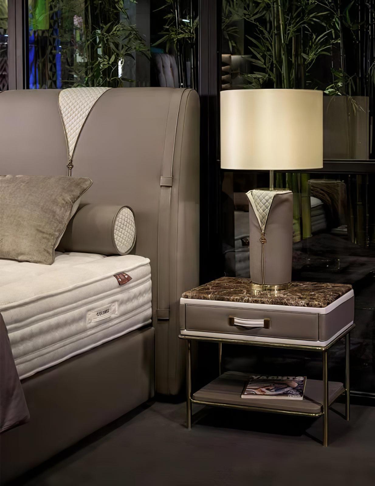 Nykyaikaisessa Bromyard-pöytävalaisimessa on valkoinen varjostin, joka korostaa rungon sekalaisia materiaaleja: metallijalusta ja harmaa nahkaviimeistely, jossa on kirkas uurrettu kultainen kaula. Tuo tyylikäs valaistus perhehuoneeseen tai olohuoneeseen tällä harmaalla pöytävalaisimella.