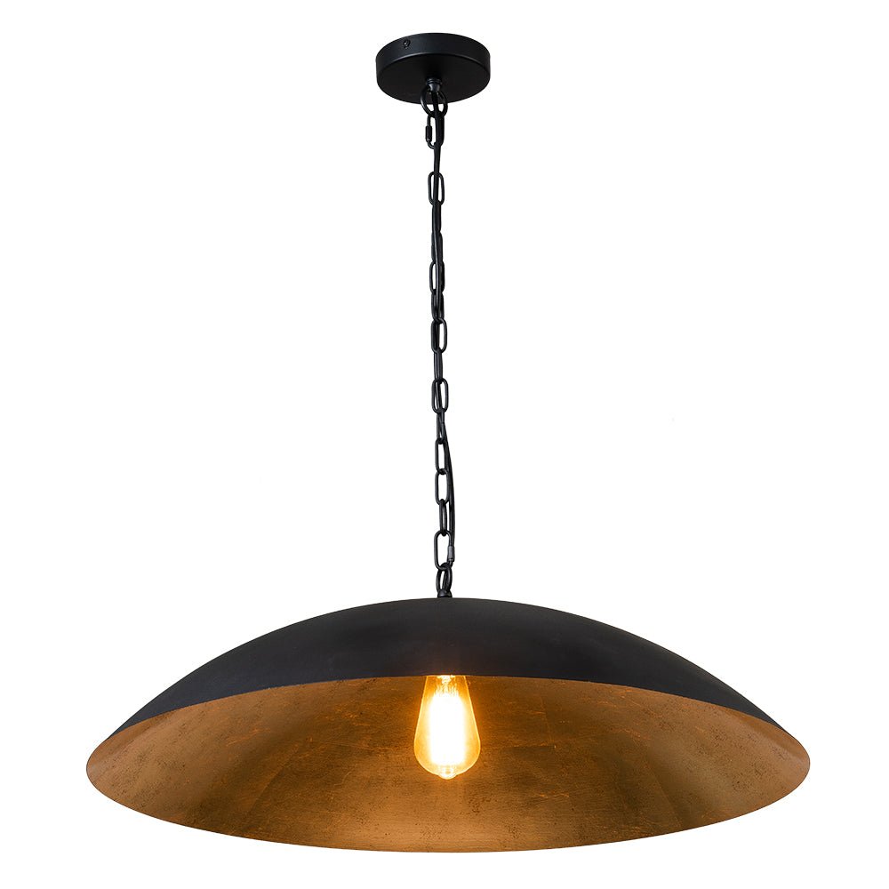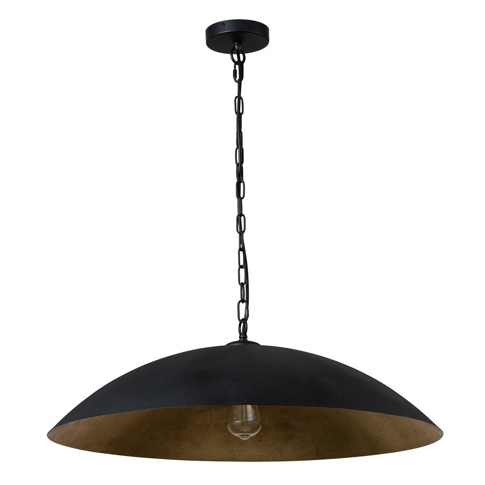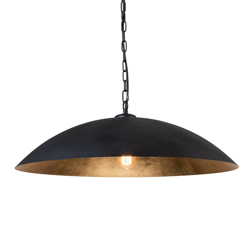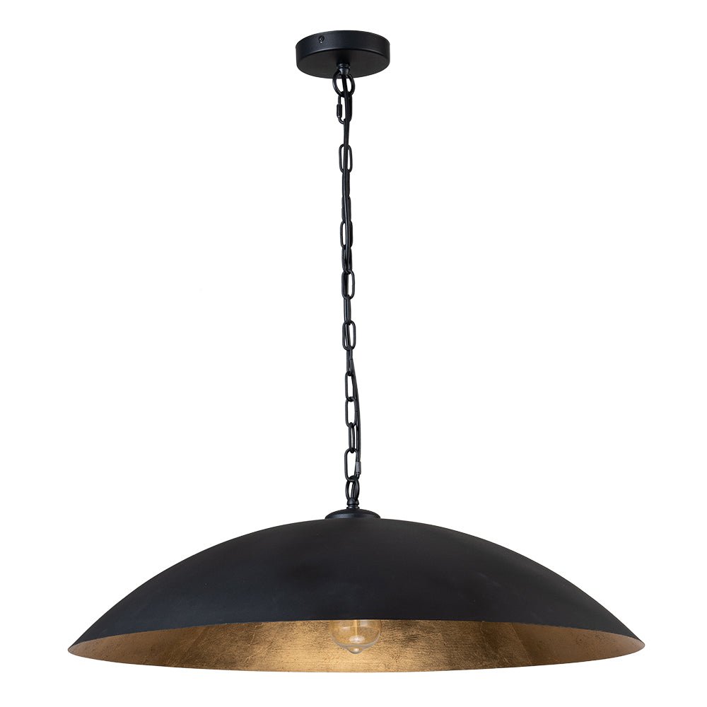 One Light • Ylimitoitettu malli • Litteä kupumuoto • Riippuketju • Rakeinen musta + kultalehtimaalattu viimeistely • E26 Keskikantainen polttimo (ei sisälly) • Kiinteä • UL-listattu