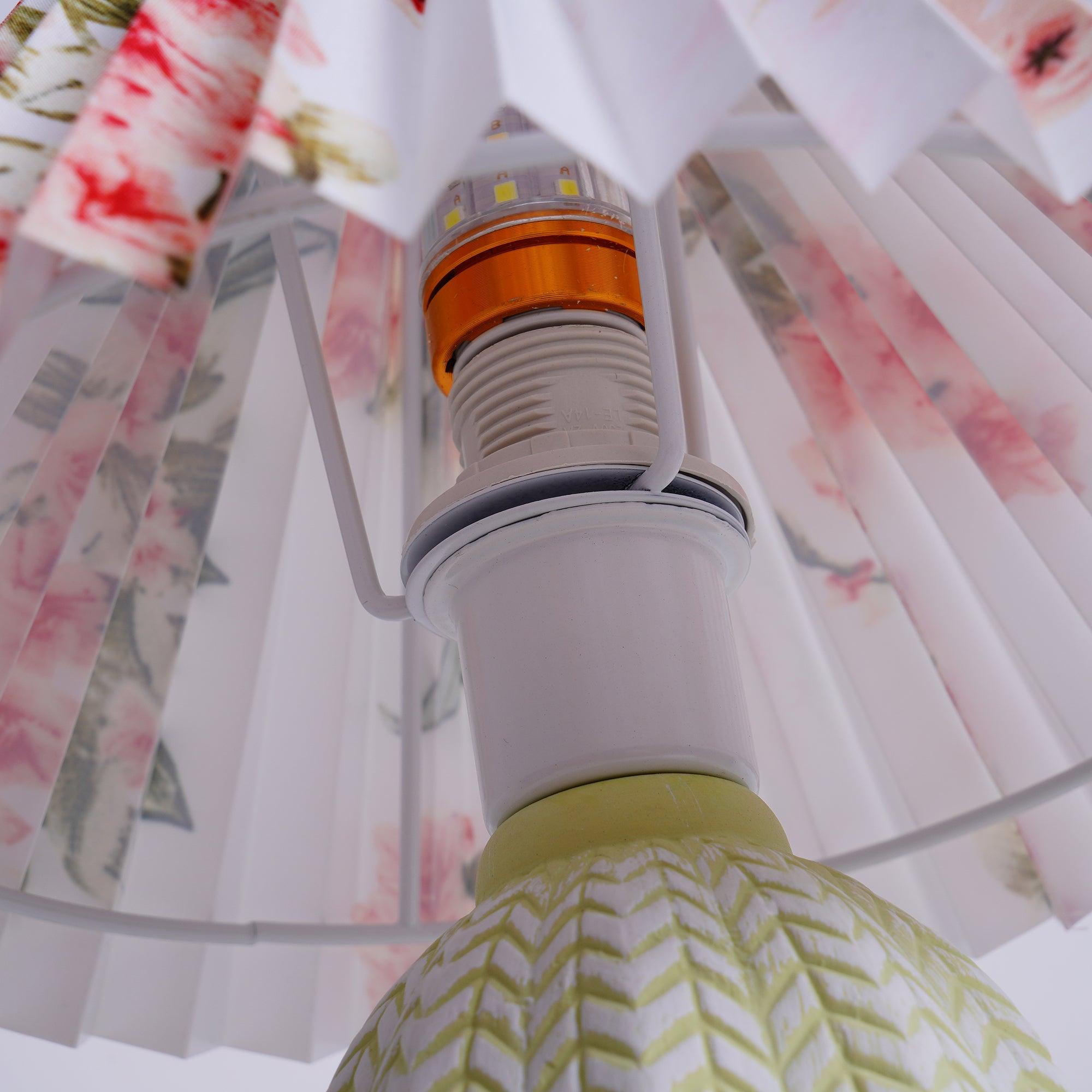 Tuotteen koko Koko: Halkaisija 24 cm x K 36,5 cm / ∅ 9,4" x K 14,4" Tiedot Materiaali: Keraami, Kangas. Valonlähde: LED- tai Edison-lamppu. Valonlähteen perustyyppi: E26 tai E27. Jännite: AC 110-240 V. Kosteudenkestävyys: IP 20 Kosteusluokitus, ei vedenpitävä, vain sisäkäyttöön. Ympäristö: Indoor. Runkopinnat: Vaaleanvihreä. Sävyviimeistely: beige, beige ja painatus. Ohjaus: Inline On/Off -painikekytkin. 59,1" johdot pistokekytkimillä. Certification: UL, ETL ja CE, SAA luettelossa.