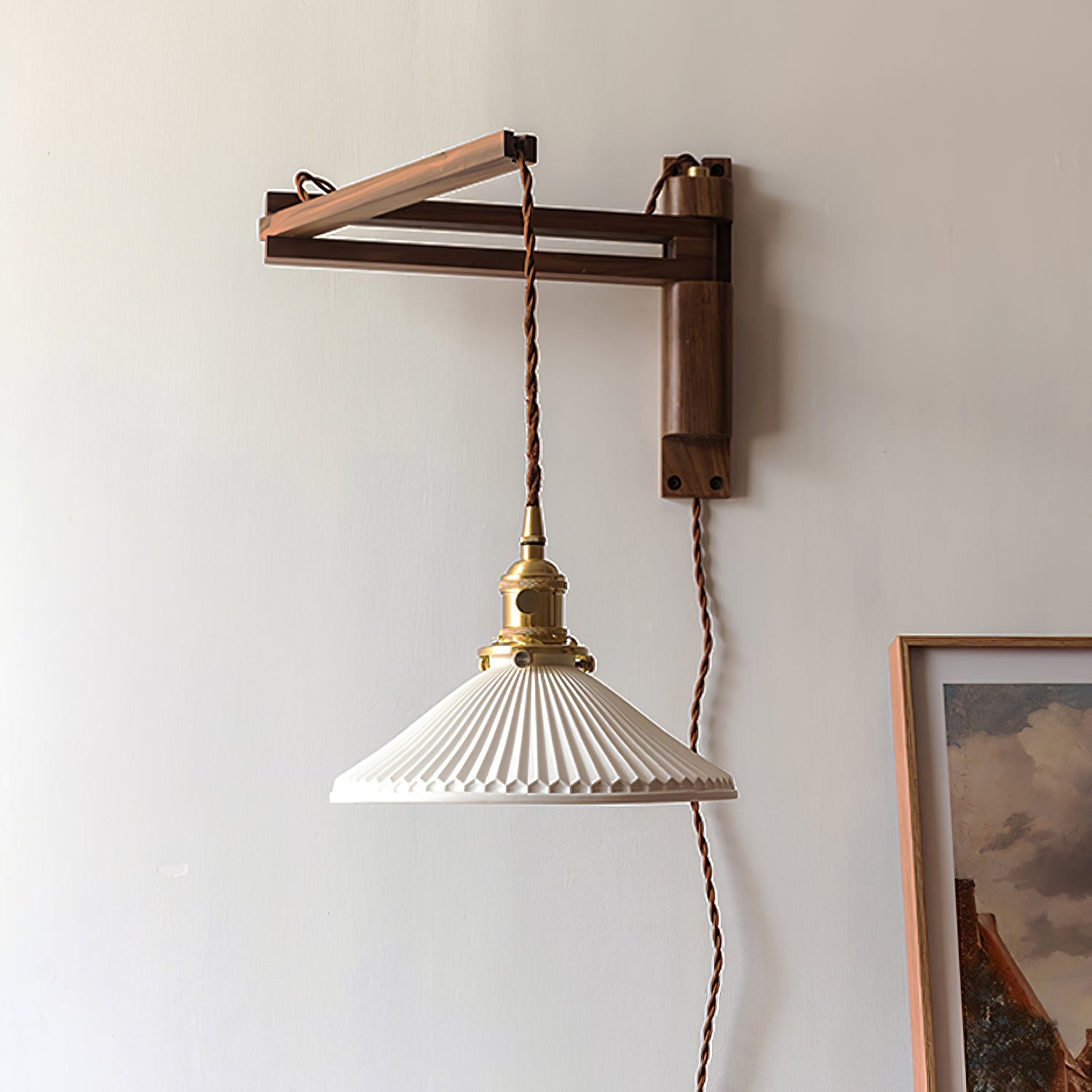 Tämä tyylikäs Walnut Swing Arm -seinävalaisin on täydellinen lisä jokaiseen moderniin kotiin. Tämä pähkinärakenne ja valkoinen laskostettu keraaminen lampunvarjostin on suunniteltu tuomaan esiin japanilaista estetiikkaa. Säädettävä kääntövarsi varmistaa laajan liikealueen, joten voit mukauttaa sen asentoa valaistustarpeesi mukaan.