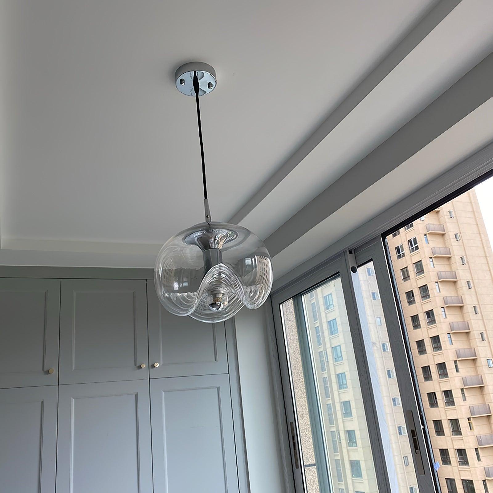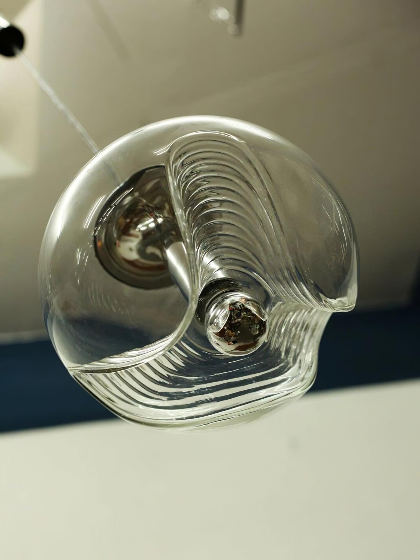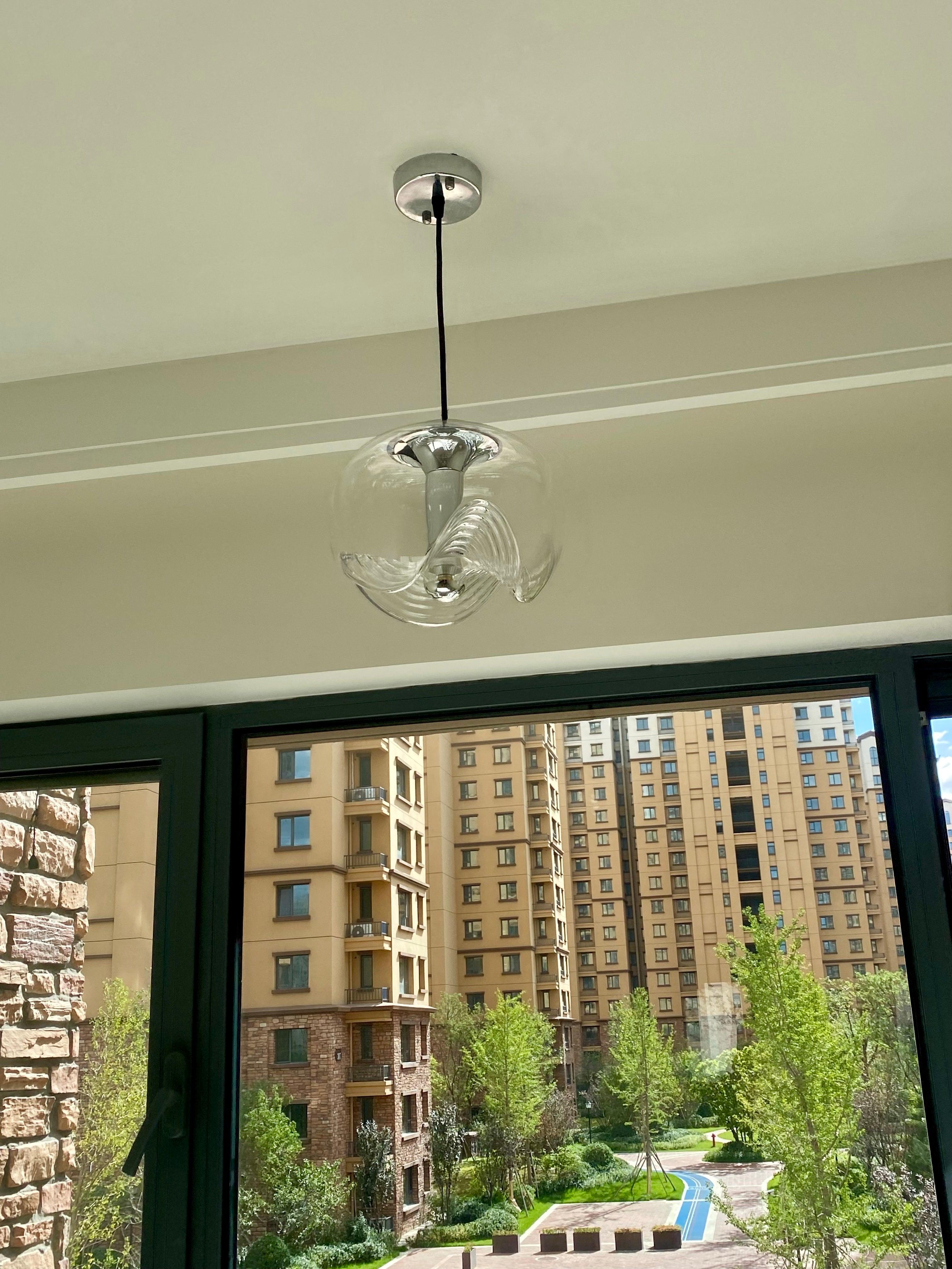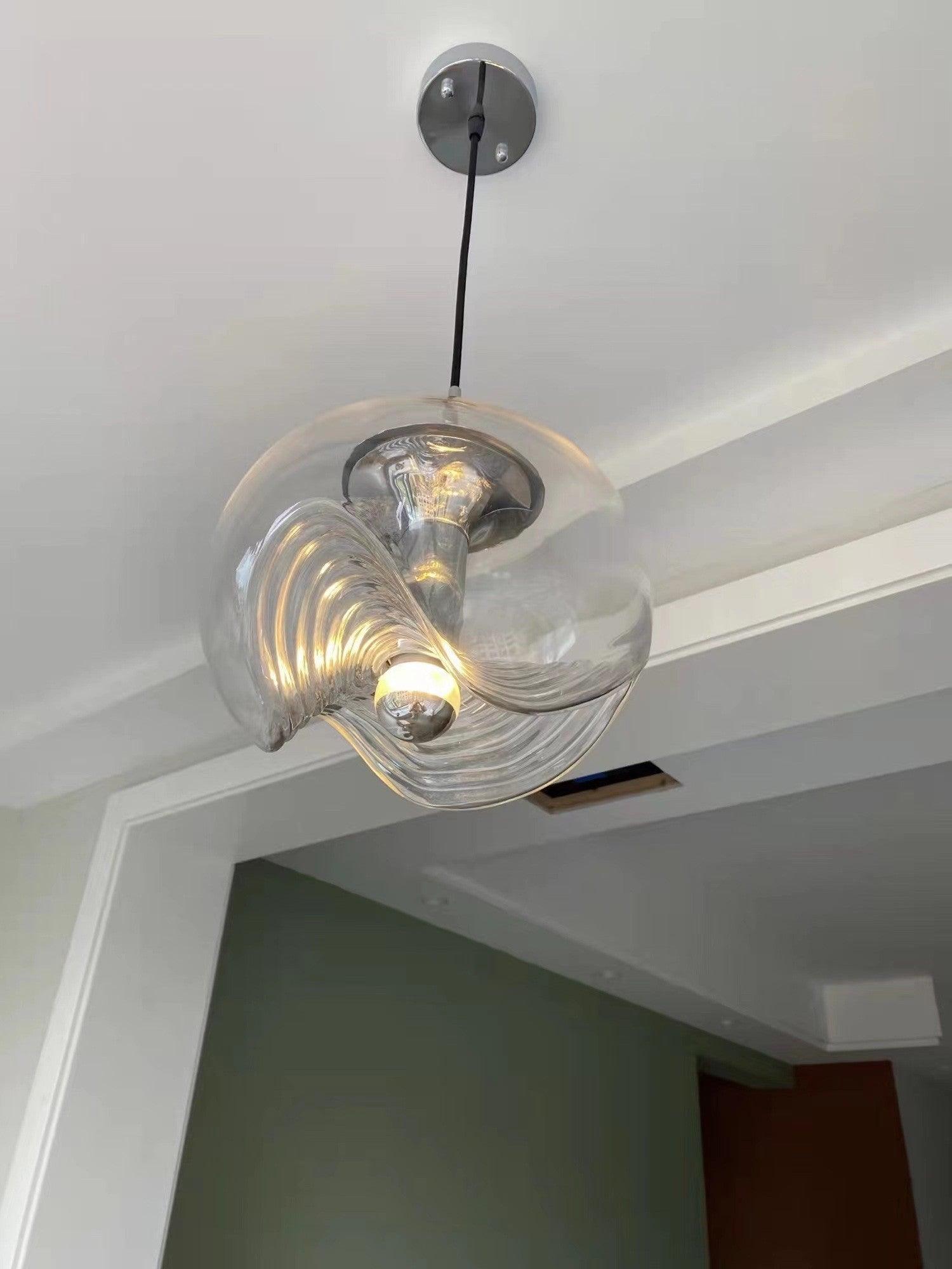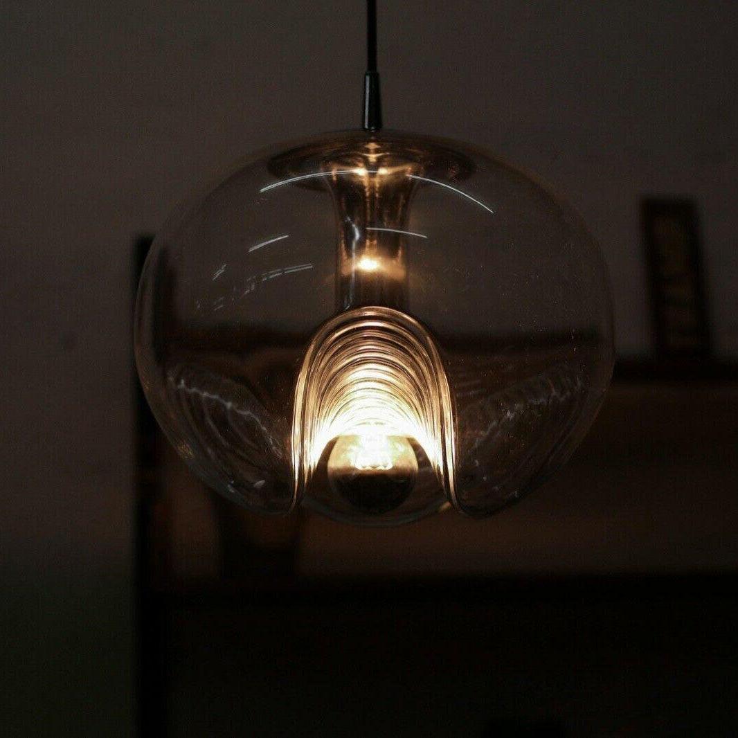 Tämä vuosisadan puolivälin moderni riippuvalaisin on yksi myymälämme suosituimmista "lasi"-sarjoista, jota kutsutaan usein "Wave"-valaisimeksi. Tässä harvinaisessa versiossa on kultaosat ja kauniin värinen lasi. hyvä vintage kunto.