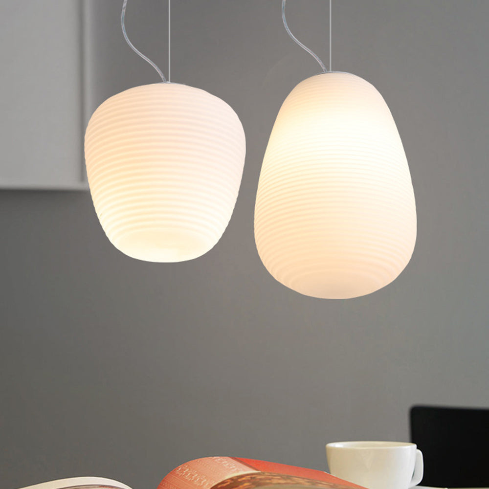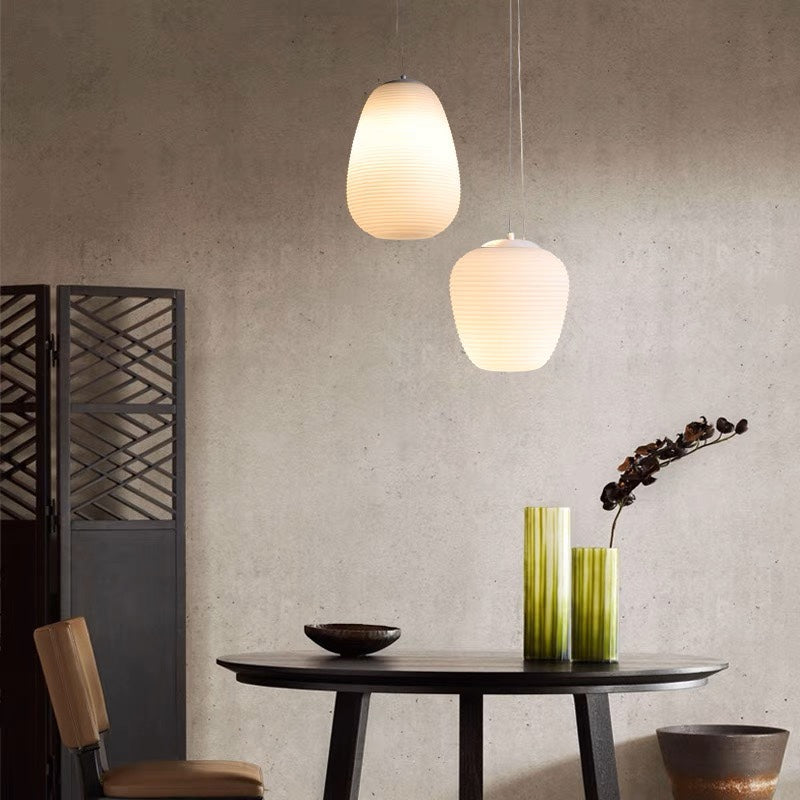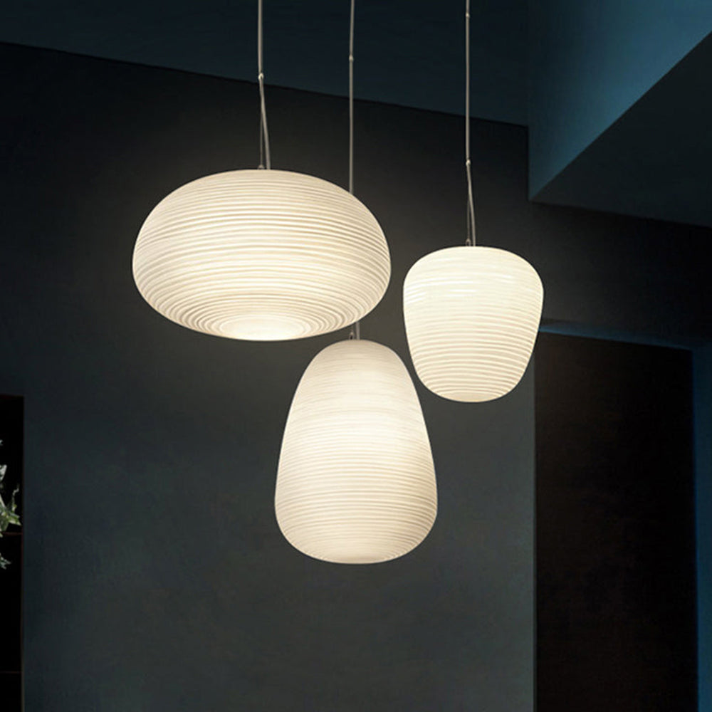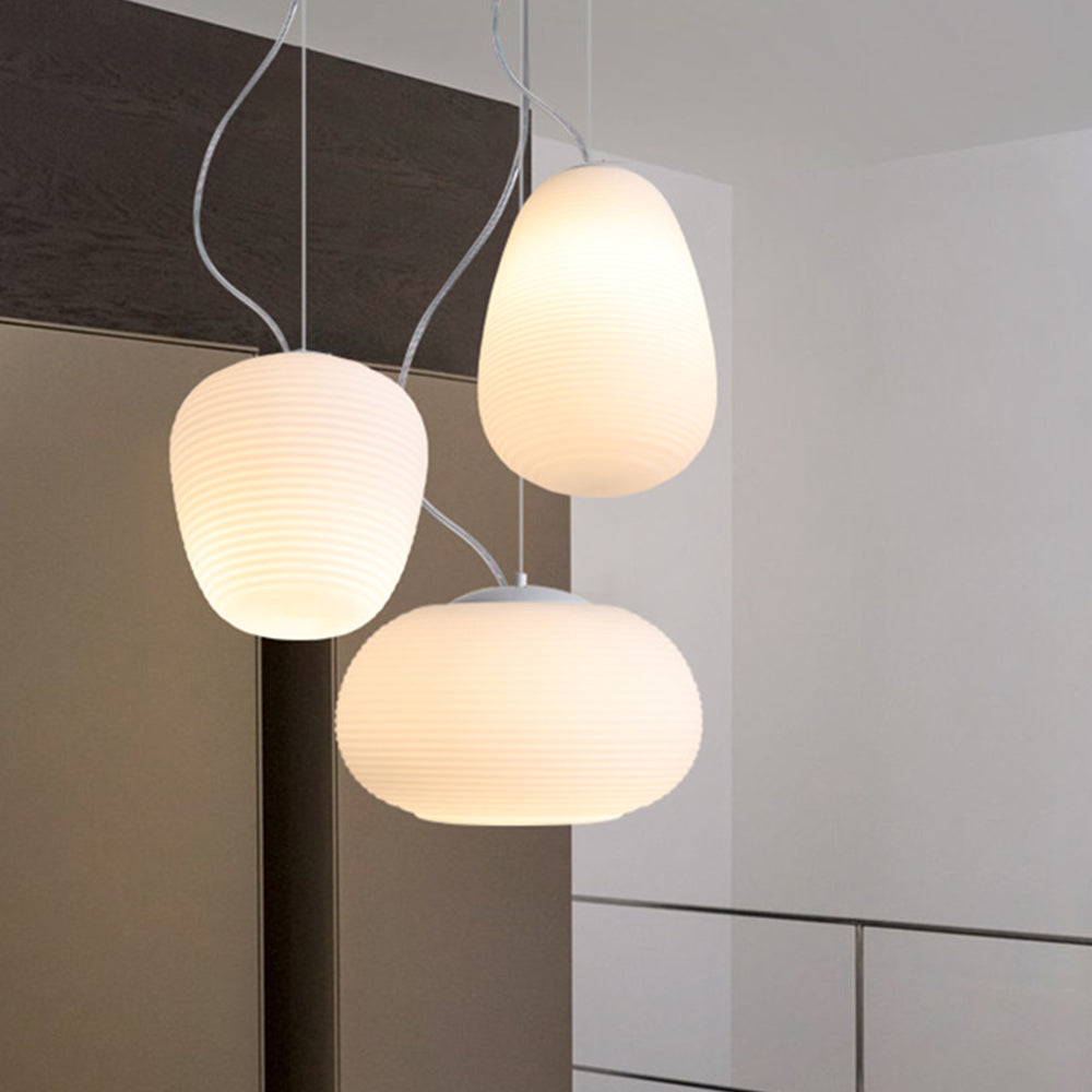 Nämä riippuvalot muistuttavat washi-paperilyhtyjä, mutta ne on valmistettu käsinpuhalletusta lasista. Saatavana erilaisissa mutta toisiaan täydentävissä muodoissa.