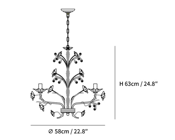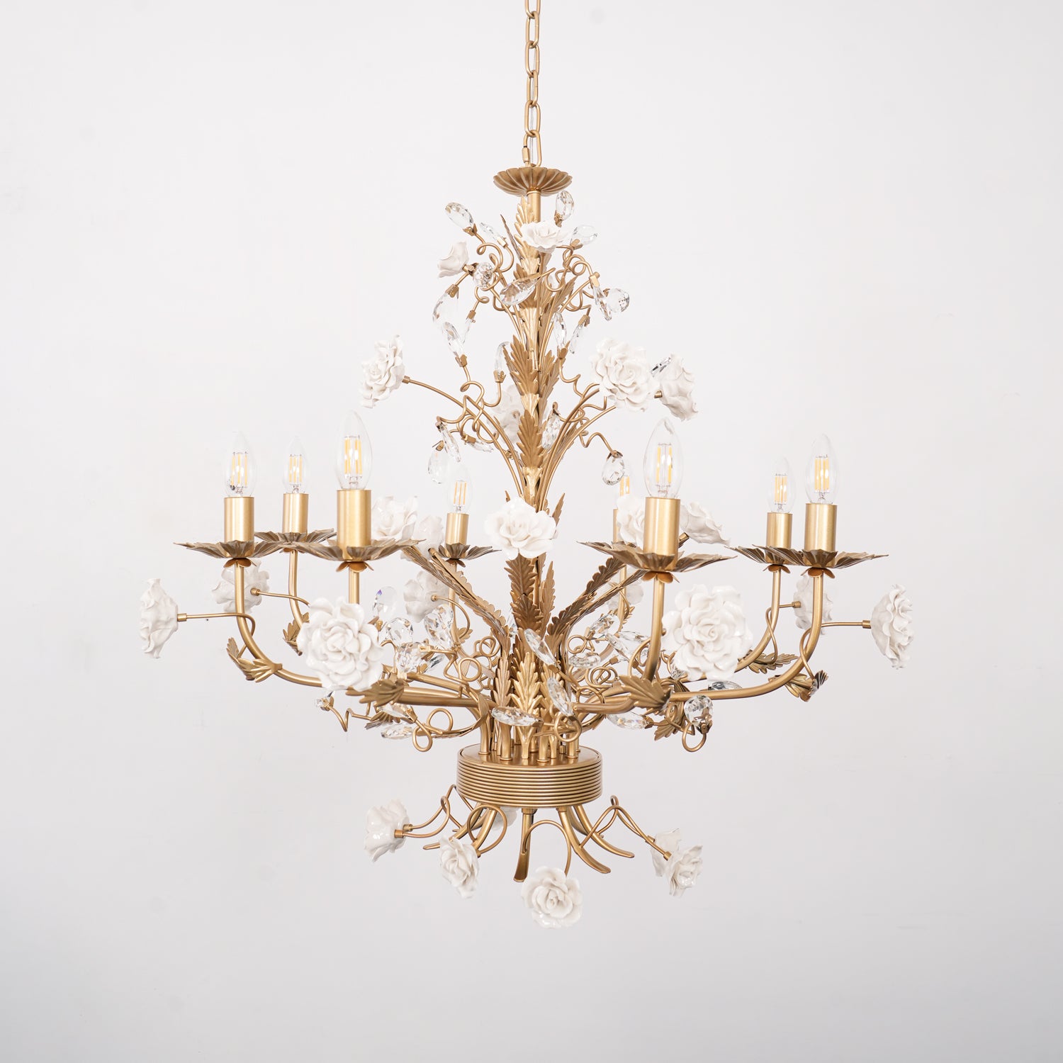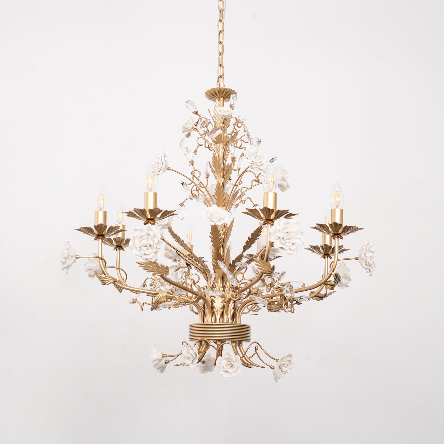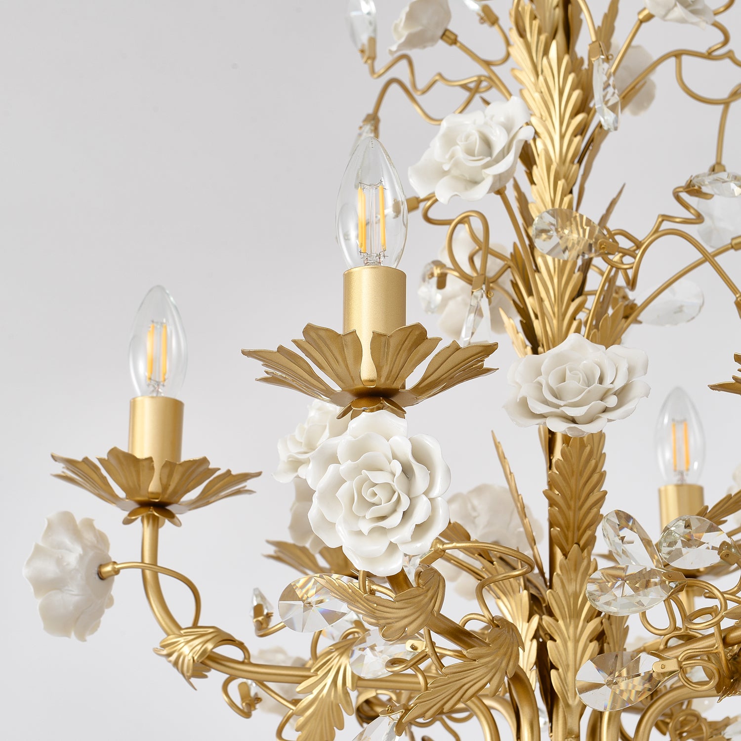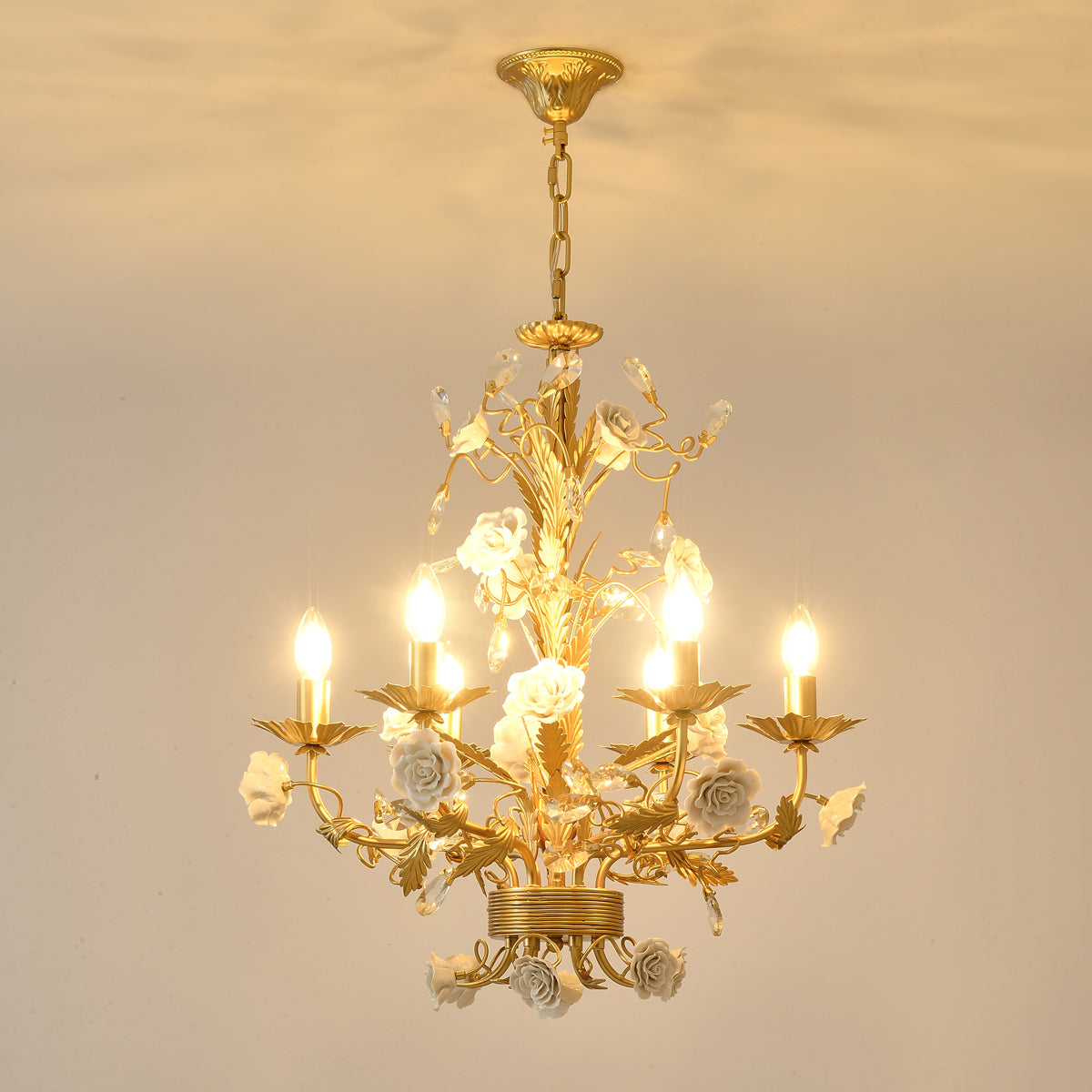 Esittelemme upean kattokruunumme, joka on todellinen eleganssin ja hienostuneisuuden ruumiillistuma. Tässä mestariteoksessa on koskemattomia keraamisia valkoisia ruusukukkia, jotka on sijoitettu kauniisti kimaltelevien kultaisten lehtien keskelle, jotka jäljittelevät kynttelikön muotoa. Jokaisen oksan välissä on kimaltelevia kristallipuloja, jotka vangitsevat ja heijastavat valoa lumoisimmalla tavalla. Kultasävyinen rakenne ei ainoastaan tarjoa tukevaa perustaa, vaan myös rikastuttaa estetiikkaa luoden kuninkaallisen tunnelman. Haluatpa sitten kohottaa asuintilasi tai lisätä ripauksen ylellisyyttä suureen saliin, tämä kattokruunu lupaa olla kiehtova keskipiste.