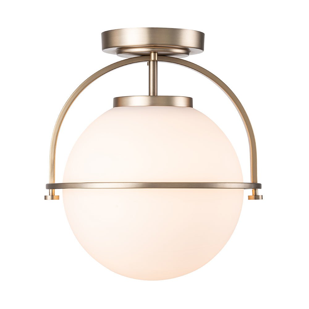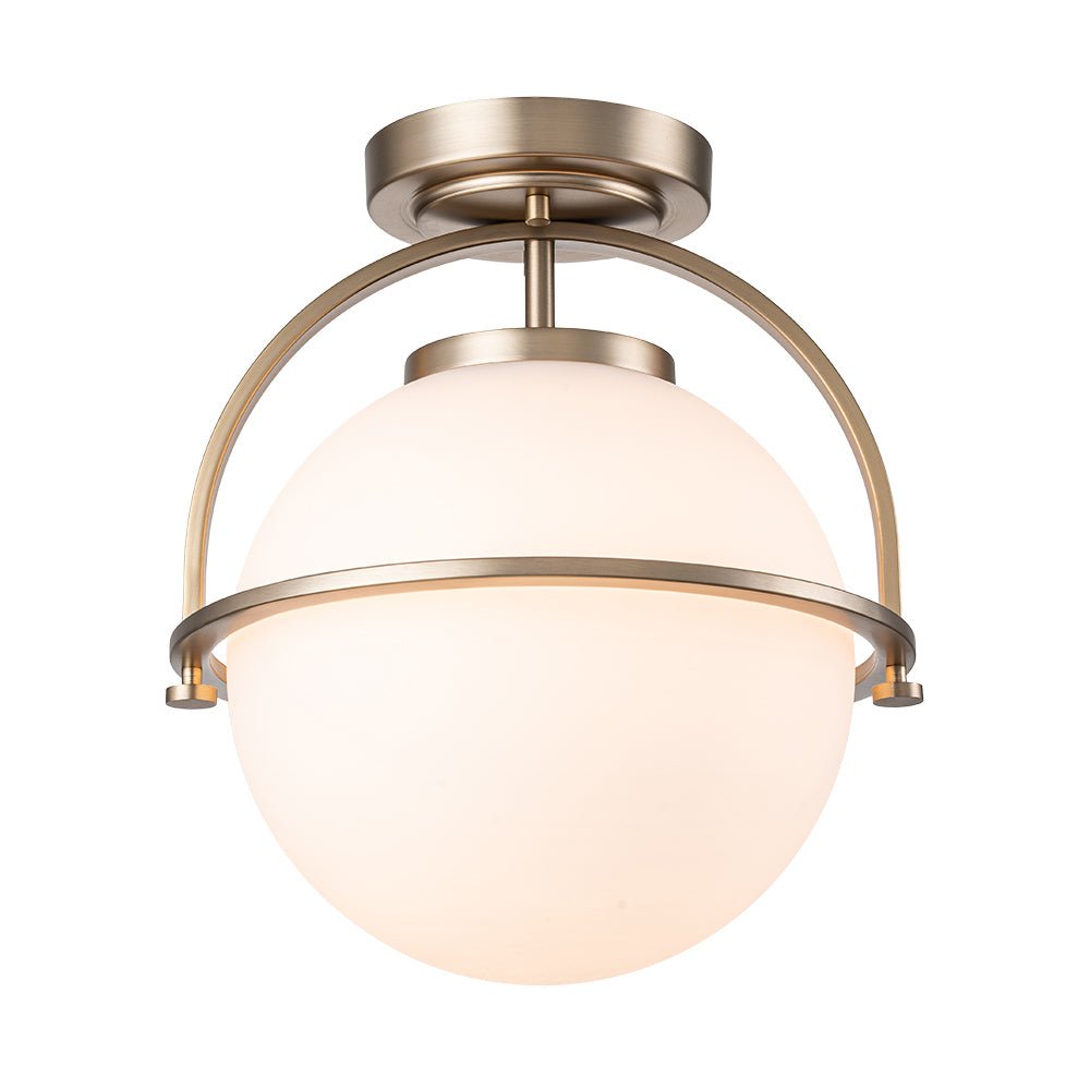 Esittelemme lumoavan yhdistelmän vuosisadan puolivälin ja ylellisiä moderneja tyylejä – tämä ylellinen 1-valaisinpallokattovalaisin. Sen virtaviivainen puolirengaskehys tukee leveää maidonvalkoista lasipalloa, joka luo ainutlaatuisen geometrisen siluetin, jonka kruunaa tyylikäs messinkiviimeistely. Tämä tyylikäs opaalilasipallo, puolitasossa asennettava valaisin luo lämpimän, kutsuvan hehkun, joka on täydellinen korostamaan minkä tahansa makuuhuoneen, eteisen, keittiön, kylpyhuoneen tai olohuoneen tunnelmaa.Tiedot