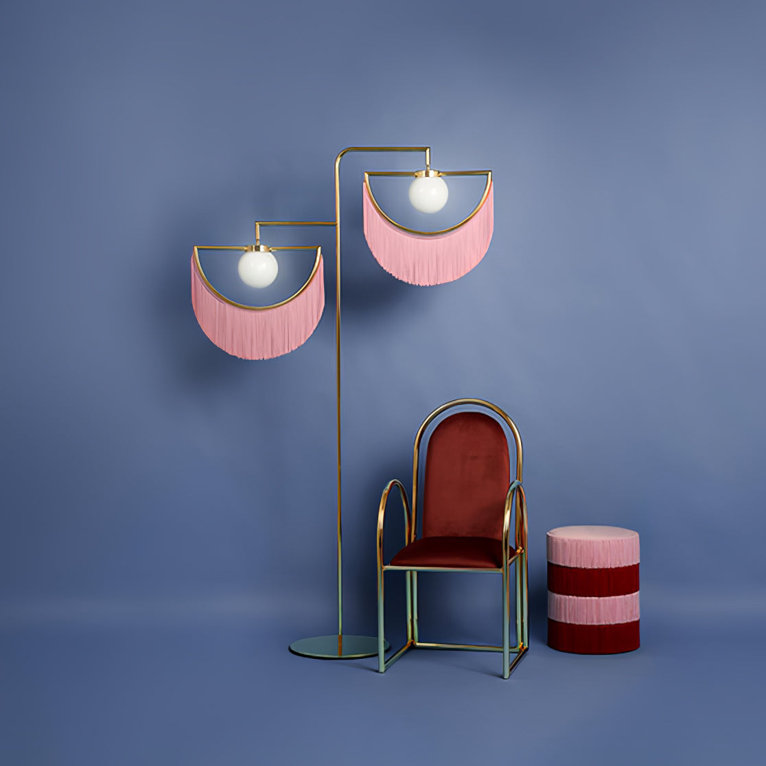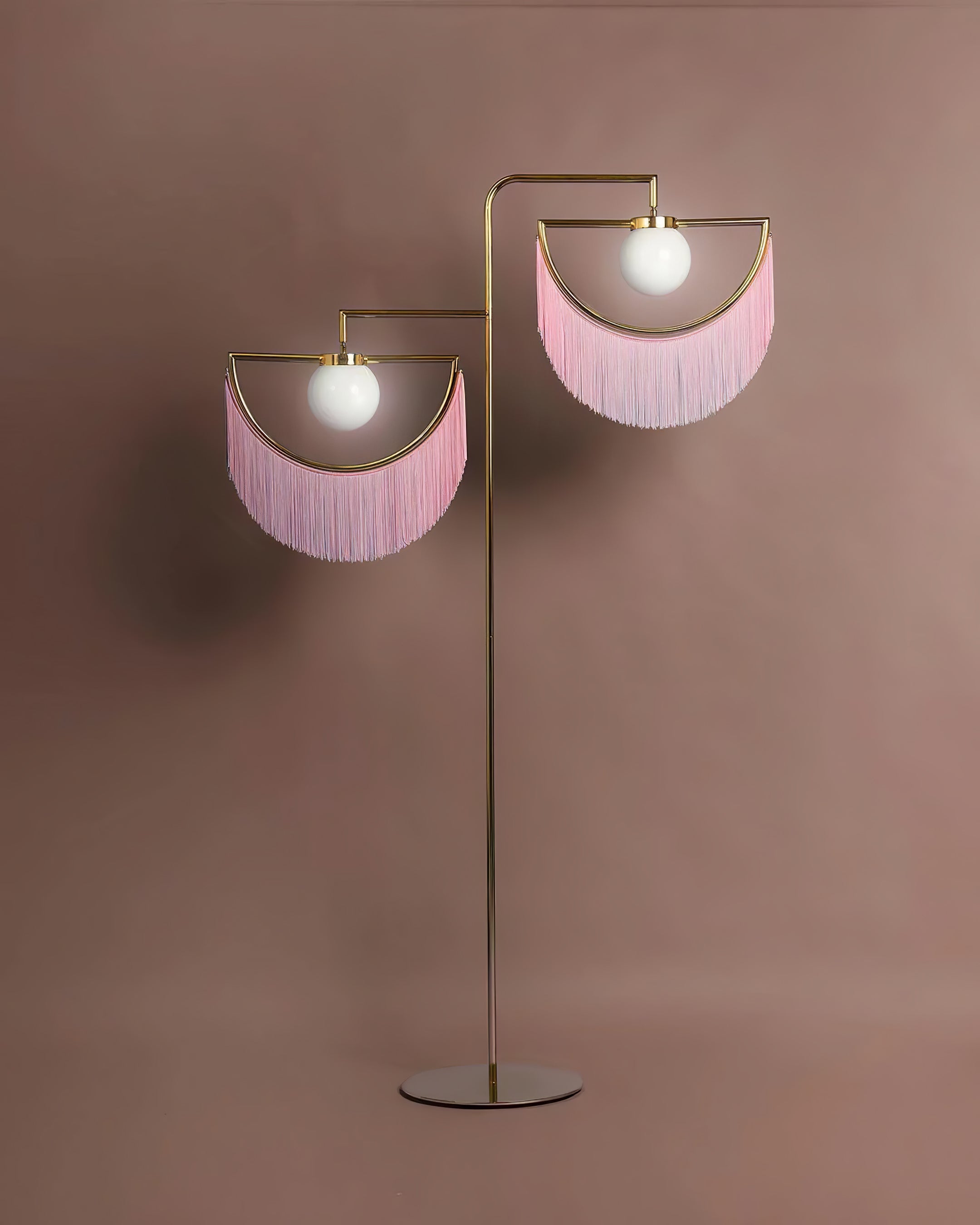 Tällainen arvokas jalokivi, hapsut koristavat tyylikkäästi kultaista metallista geometrista rakennetta. Sateenkaaren jäykkyys toimii ristiriidana hapsujen haurauden ja herkkyyden kanssa. Tämä silkkinen ja kevyt verho pyörii hellästi ilmavirtojen vaikutuksesta... Wink vetää sekä silmää että kättä: haluat hyväillä ja ajaa käsiäsi sen läpi liu'uttamalla ne tämän kosketuksen lämpöisen villan vesiputouksen sisään . Lamppu on sijoitettu herkän valkoiseen lasipalloon.