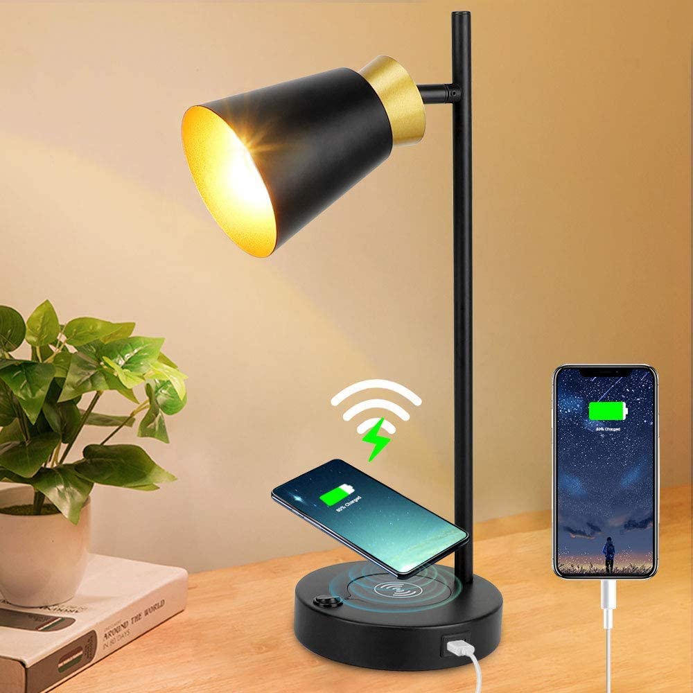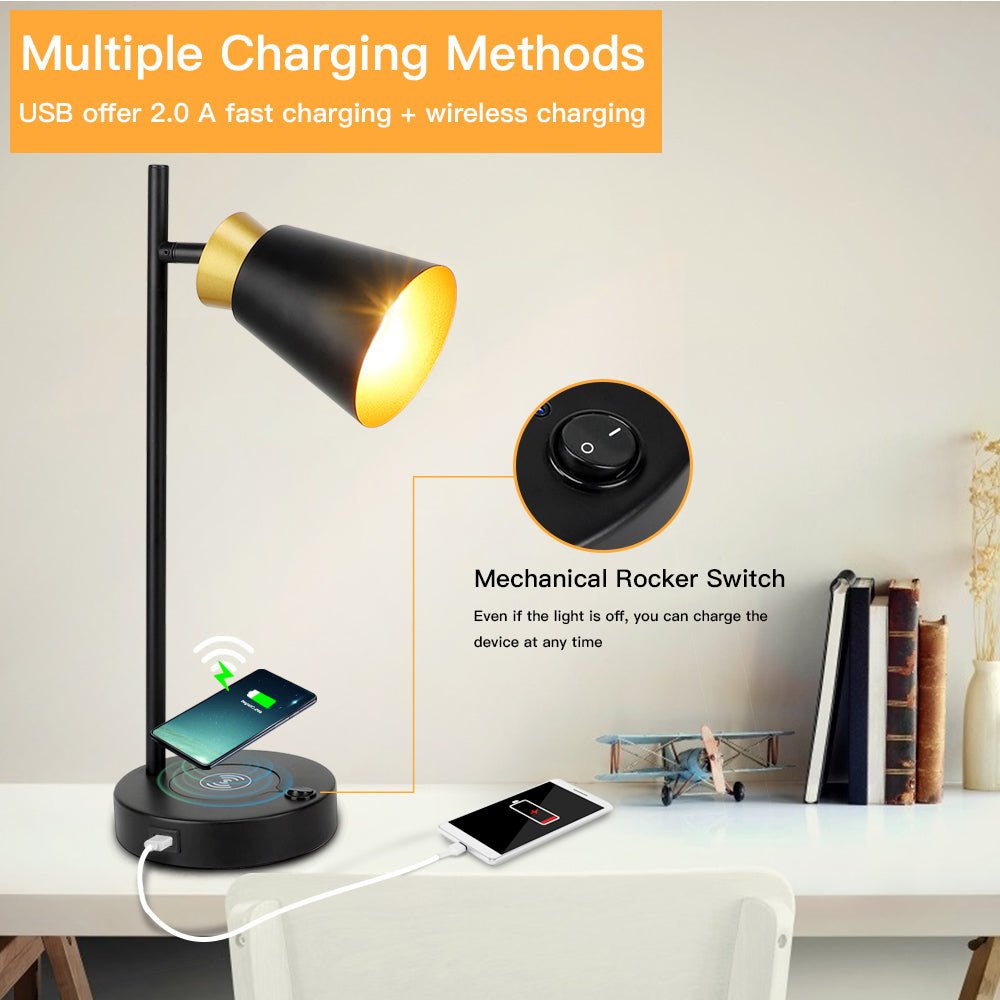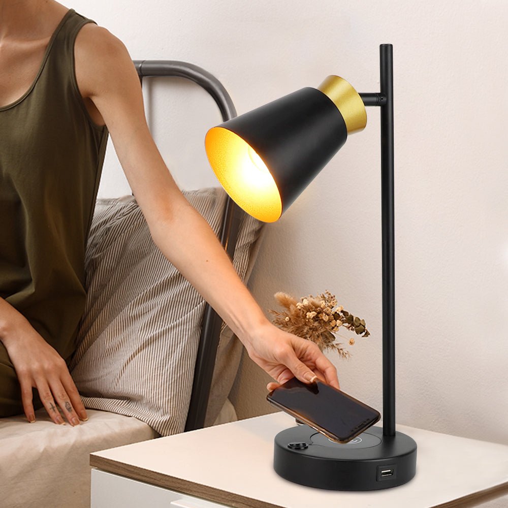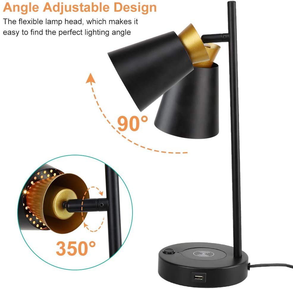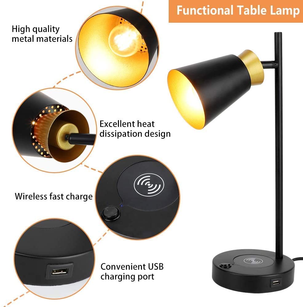 DINGLILIGHTING Yöpöytävalaisin langattomalla laturilla ja USB-latausportilla, säädettävä musta vintage-metallinen pöytävalaisin sängyn viereen, olohuoneeseen ja toimistoon, lamppu mukana, lahjaksi