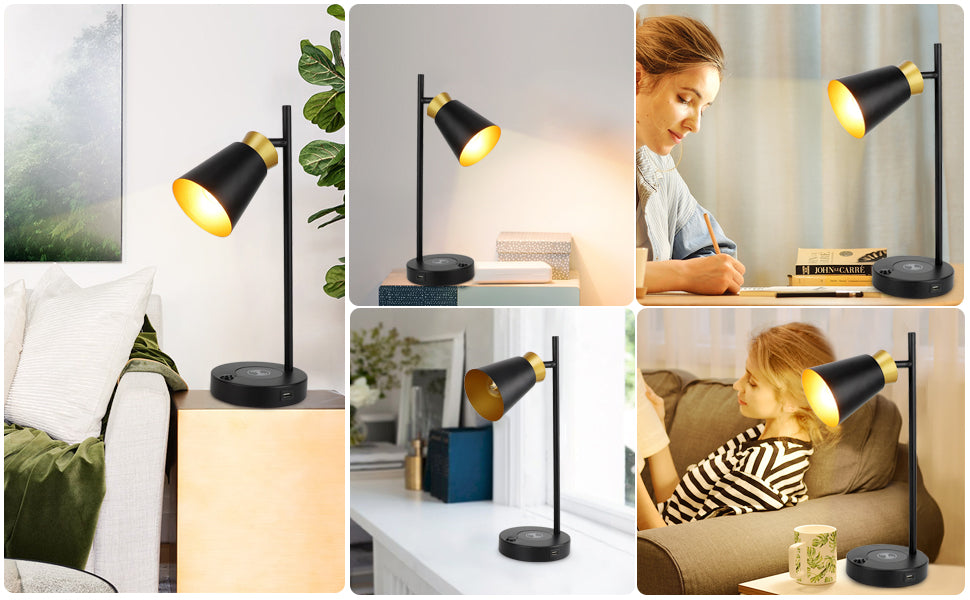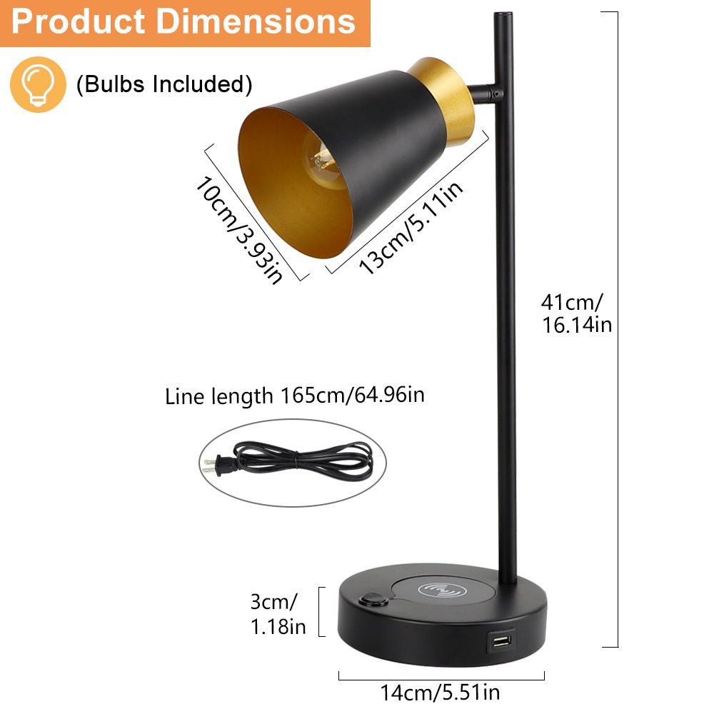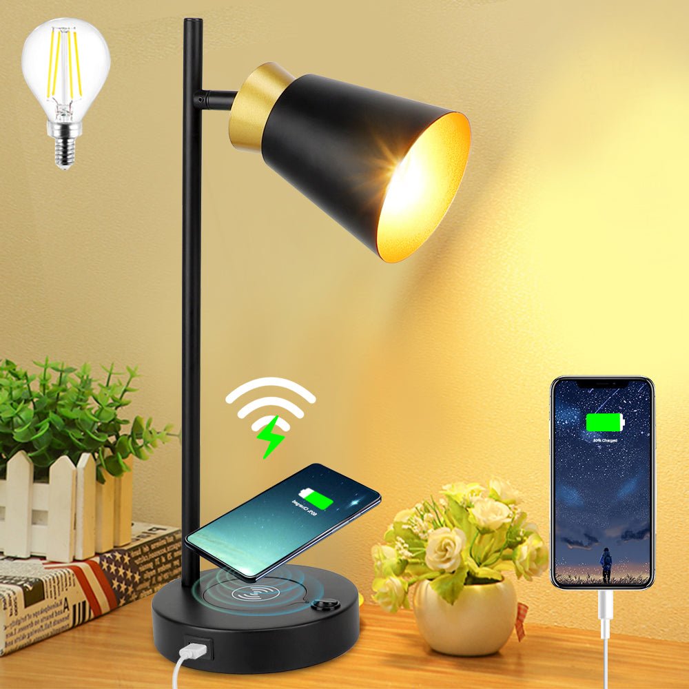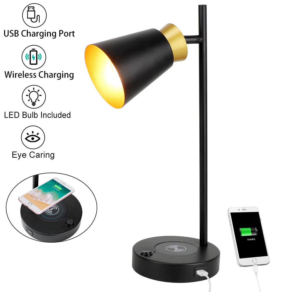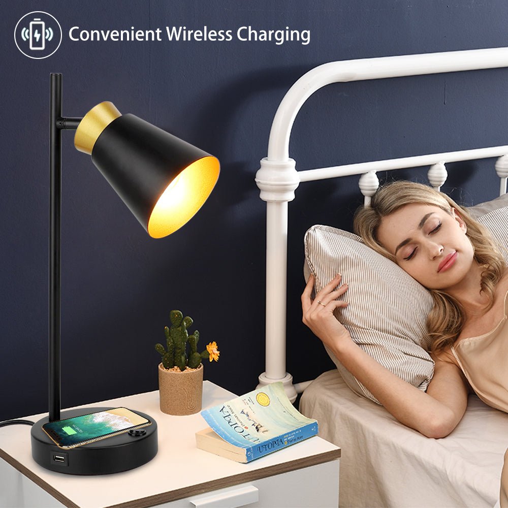 DINGLILIGHTING Yöpöytävalaisin langattomalla laturilla ja USB-latausportilla, säädettävä musta vintage-metallinen pöytävalaisin sängyn viereen, olohuoneeseen ja toimistoon, lamppu mukana, lahjaksi