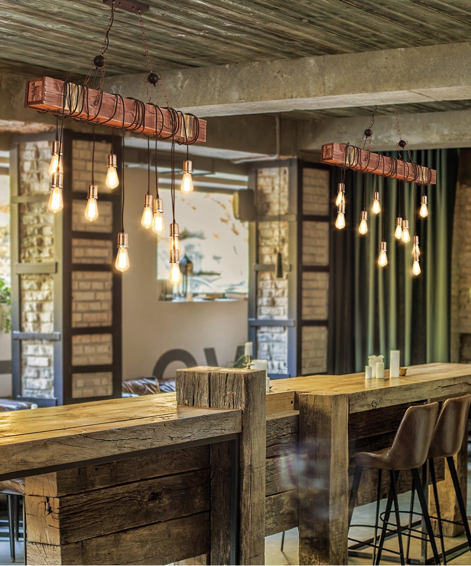 Luo turmeltumaton eleganssi kodin sisustukseen tällä 10 valon saarivalaisimilla. Muistuttavat Edison-sipulit kietoutuvat tumman kierrätyspuupalkin ympärille luovat tämän mestariteoksen. Ruosteiset pyöreät rautapallot ketjuilla kiinnittävät valaisimen suorakaiteen muotoiseen katokseen, mikä lisää tähän malliin komeaa hienostuneisuutta ja eleganssia. Keittiösaaren, ruokapöydän ja biljardipöydän päälle tai olohuoneeseen se tuo maalaistalon karismaa ja maalaismaista tyyliä.