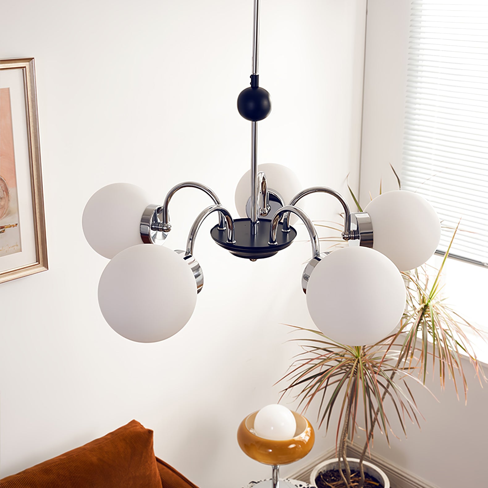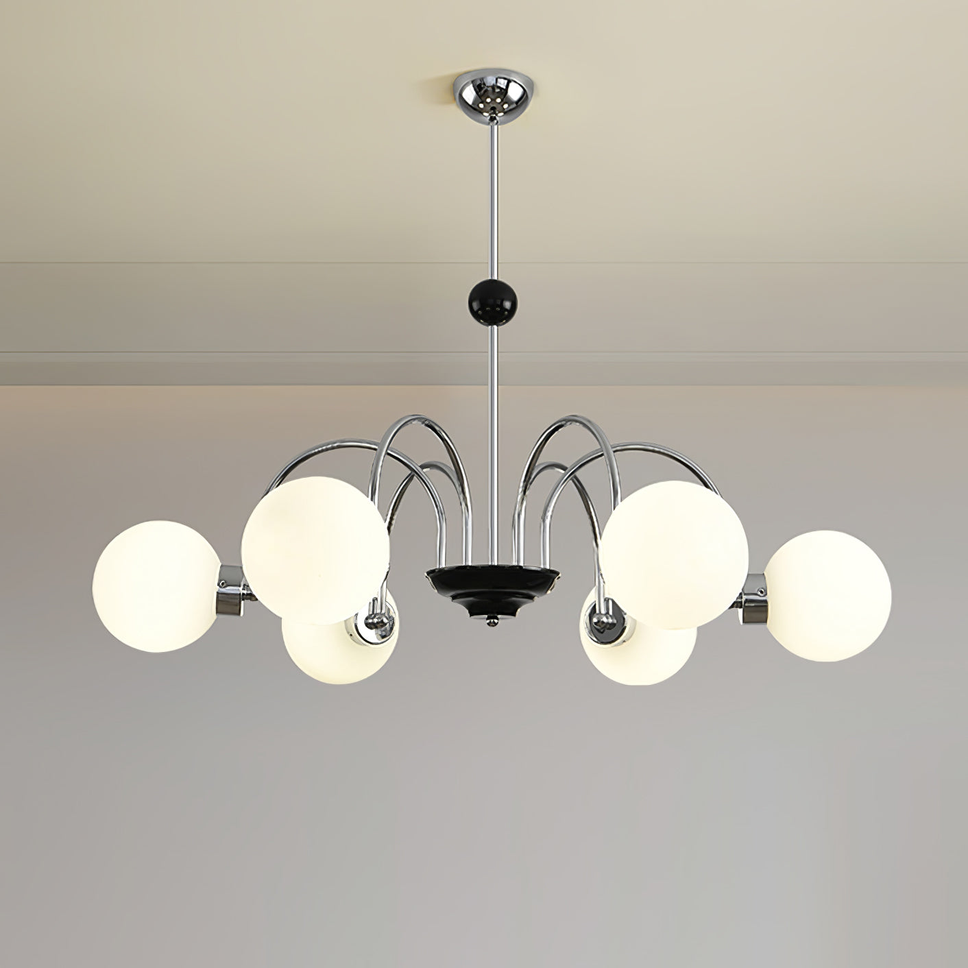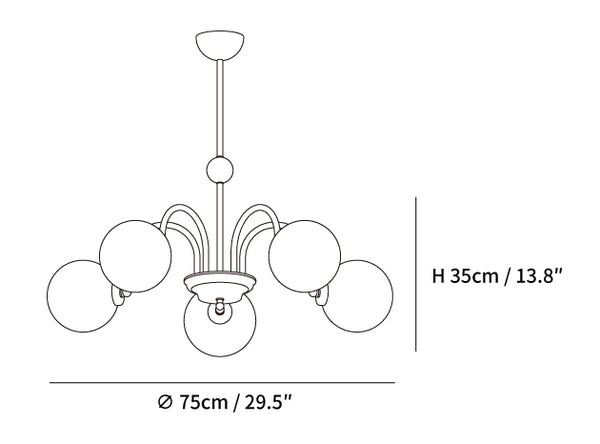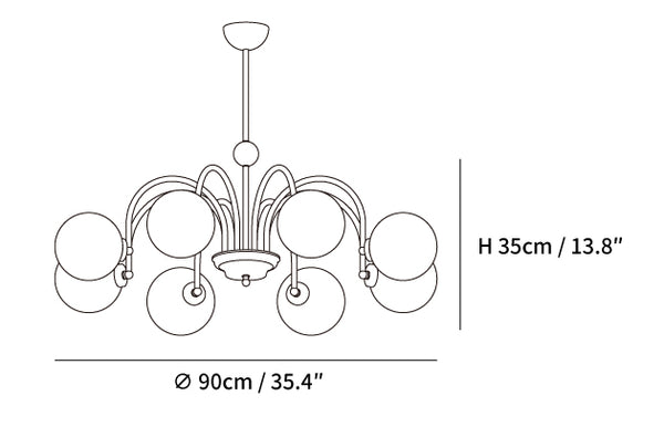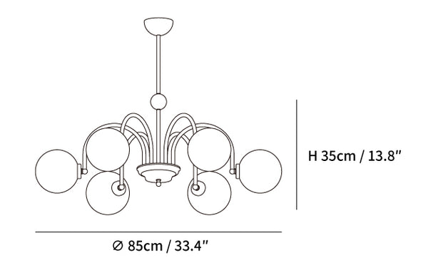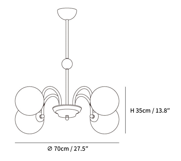 Yisu-kattokruunu tuo modernia ja kaunista ilmettä asuintilaasi. Sen ainutlaatuinen muotoilu koostuu metallitangon rungosta, joka on koristeltu valkoisilla lasipalloilla, jotka luovat kodikkaan valon diffuusiovaikutelman. Täydellinen vuosisadan puolivälin moderniin tai tasokkaaseen ympäristöön.